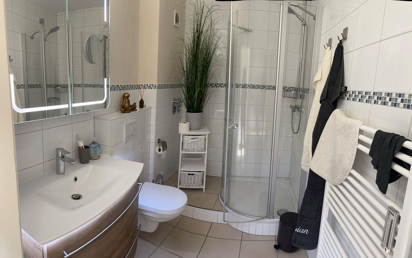 Das hell geflieste Badezimmer ist mit einer Dusche, Waschbecken, WC und Handtuchheizkörper ausgestattet.