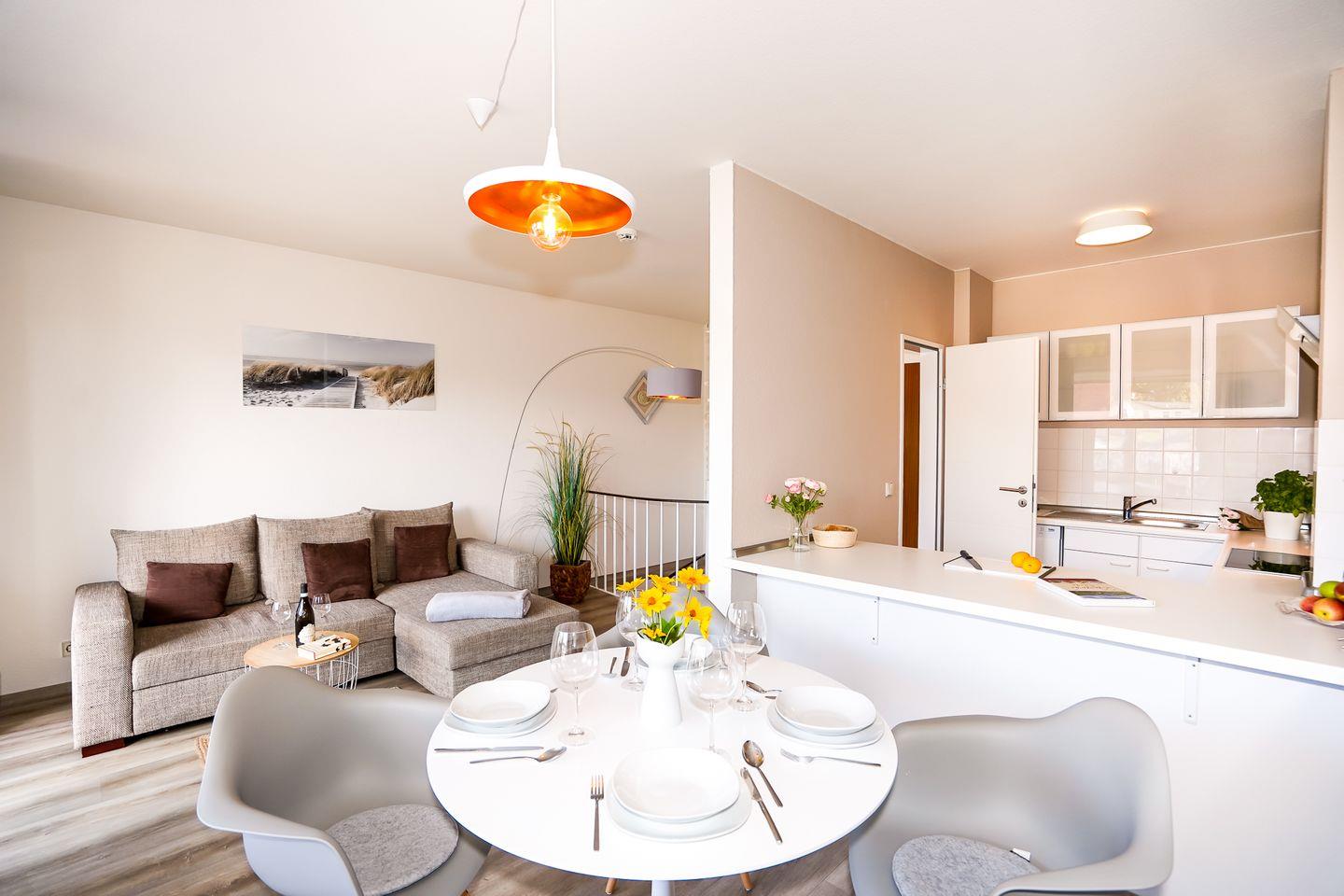 Das Appartement Sonnenkieker in Grömitz bietet auf 65 m² ein Schlafzimmer, einen offenen Wohnbereich und eine voll ausgestattete Küche. Nur 100 Meter vom Sandstrand entfernt, verfügt die Nichtraucher-Unterkunft über Balkon, Terrasse, WLAN, privaten Tiefgaragenstellplatz und vielfältige Freizeitmöglichkeiten. Kinder sind willkommen, ein Haustier ist gestattet.