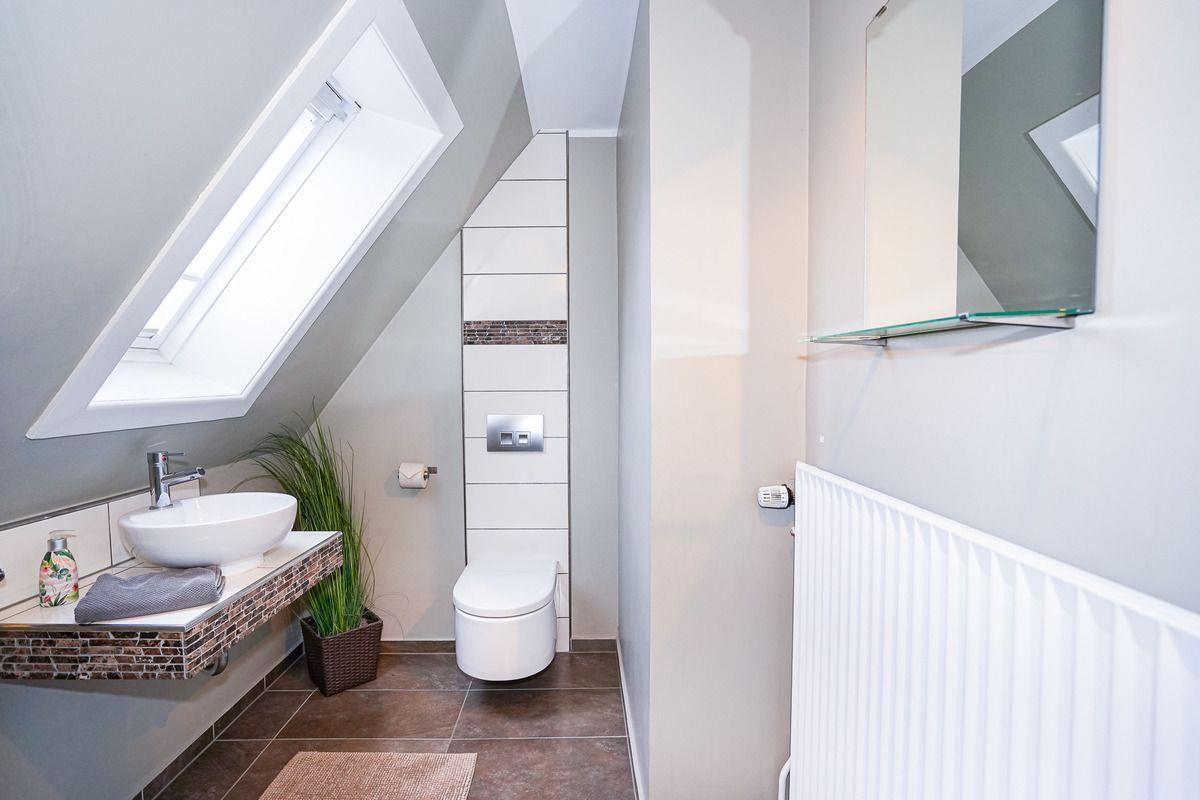 In der ersten Etage befinden sich ein großes Schlafzimmer mit einem direkten Zugang zur schönen Dachterrasse, ein modernes Duschbad mit großer Echtglasdusche und ein separates WC.