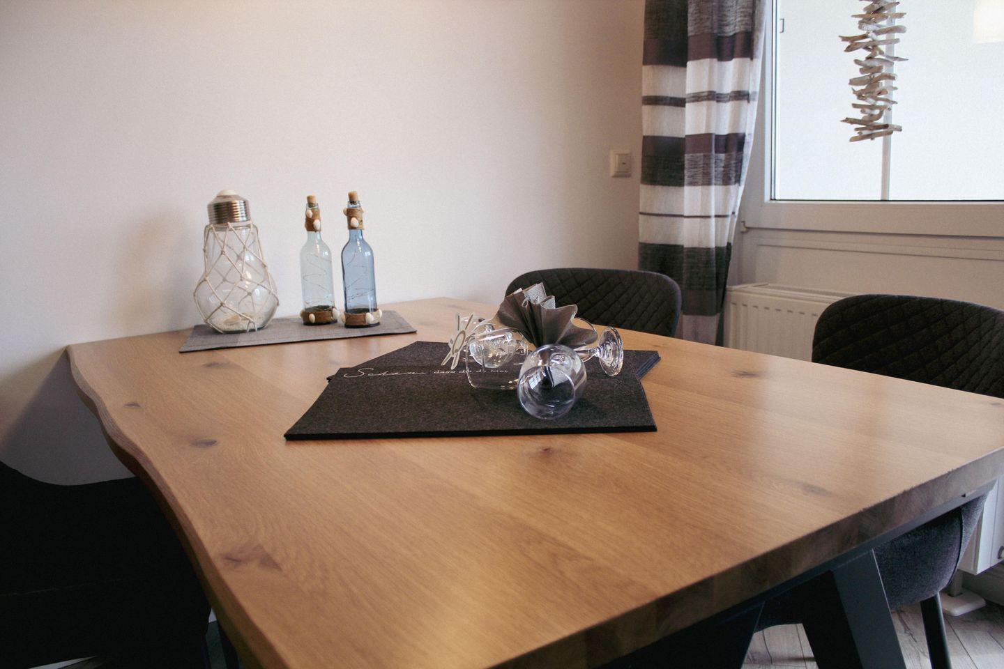 Diese Wohnung verfügt über zwei Schlafzimmer: Eins mit Boxspringbett 1,80 x 2 m, Kleiderschrank und Fernseher sowie ein Schlafzimmer mit einem Etagenbett (2 Schlafplätze je 0,90 x 2 m). Dazu gibt es ein modernes Duschbad sowie ein separates Gäste-WC. Der kombinierte Wohn-/Essraum hat eine schöne Küchenzeile - allerdings ohne Backofen und ohne Geschirrspüler!
