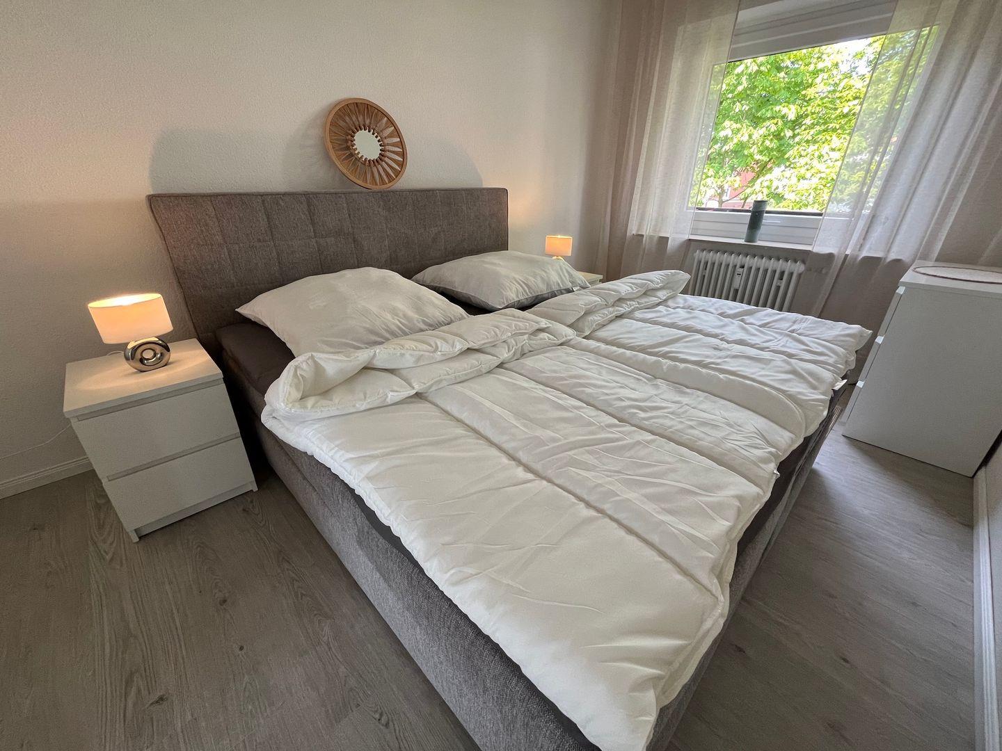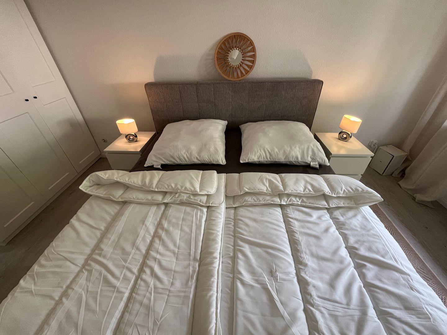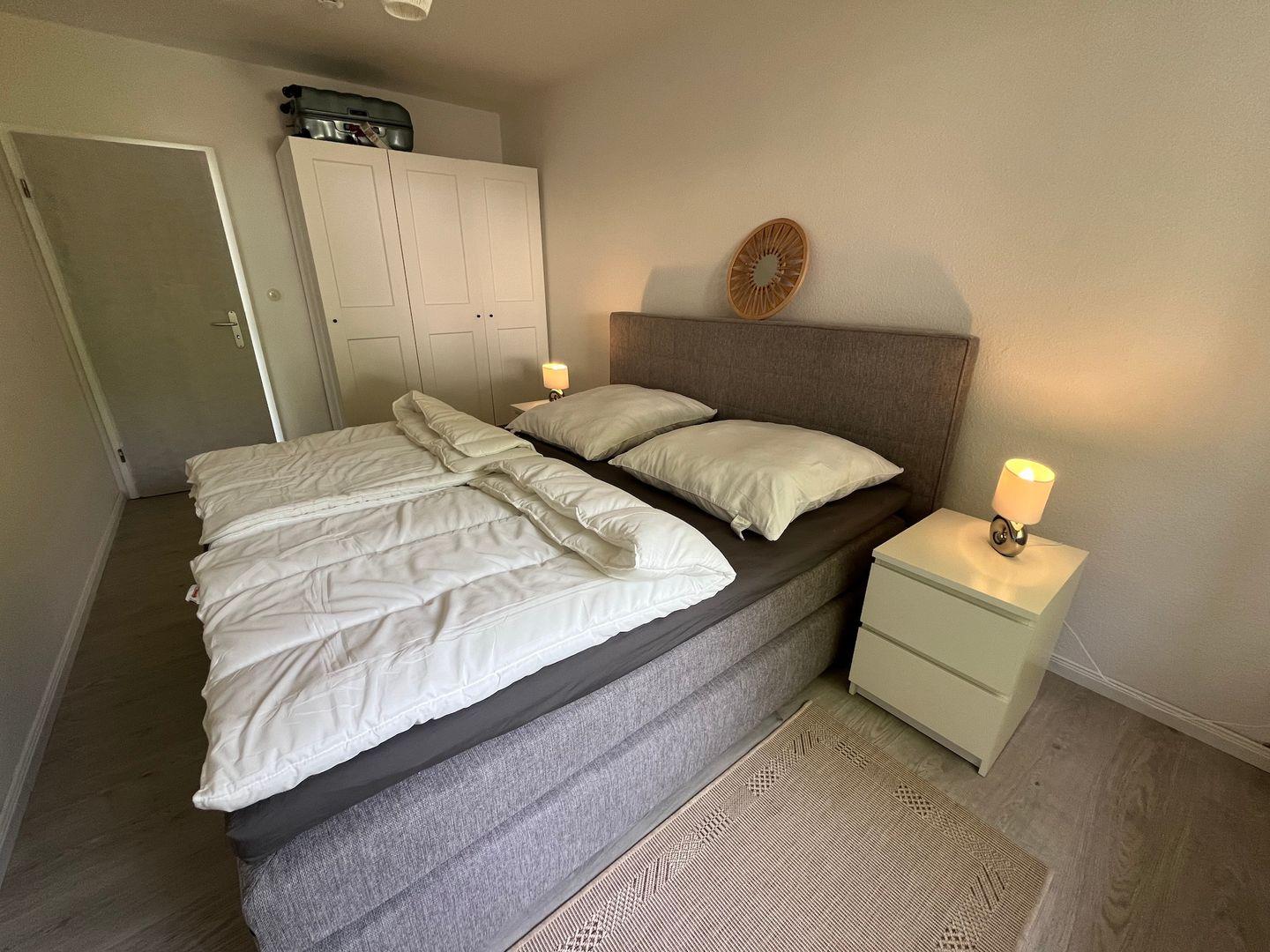 Es erwartet Sie zudem ein separates Schlafzimmer mit Boxspringbett (180cm x 200cm) zum ausschlafen und entspannen, inkl. Verdunkelungsrollo.