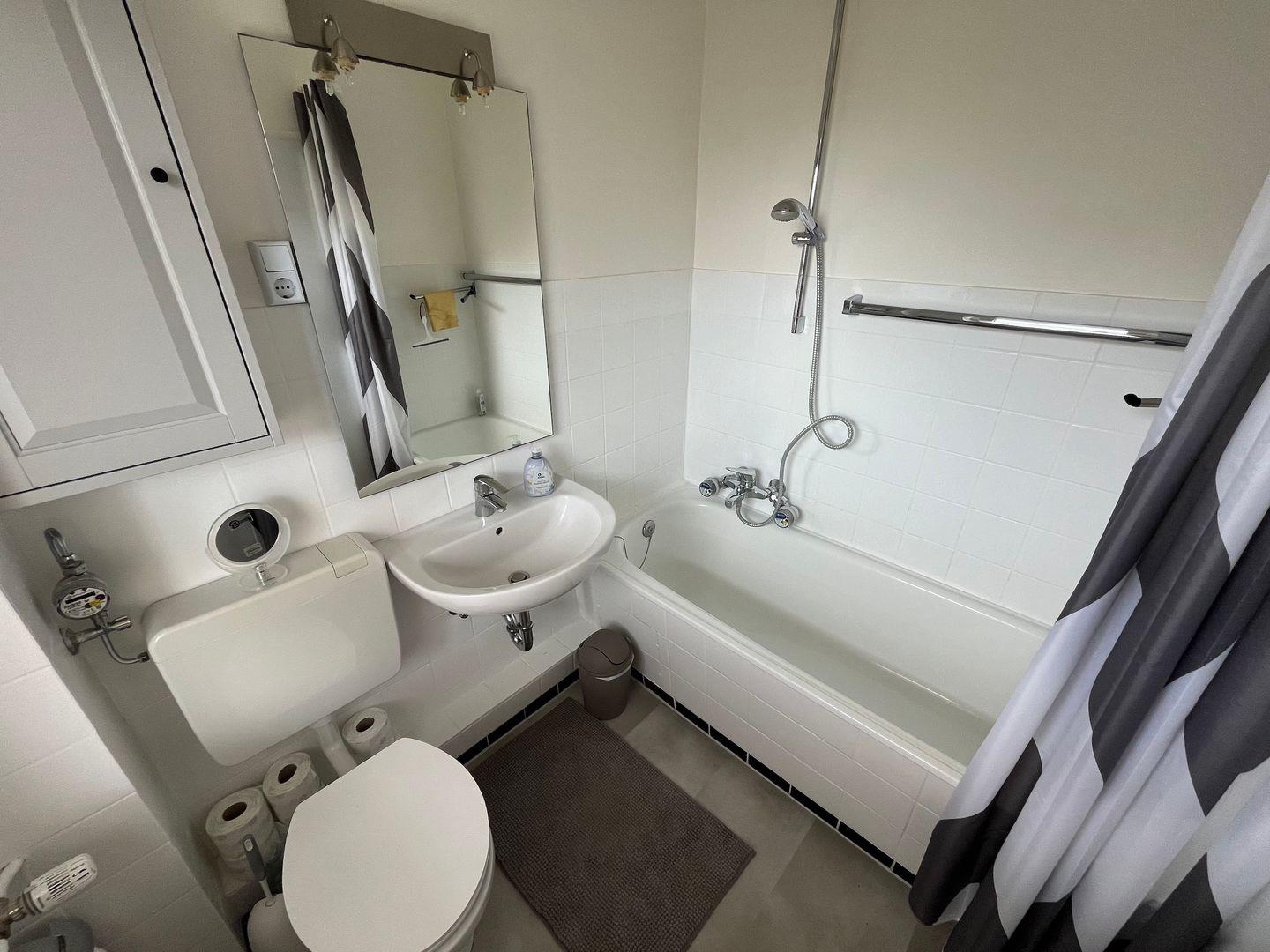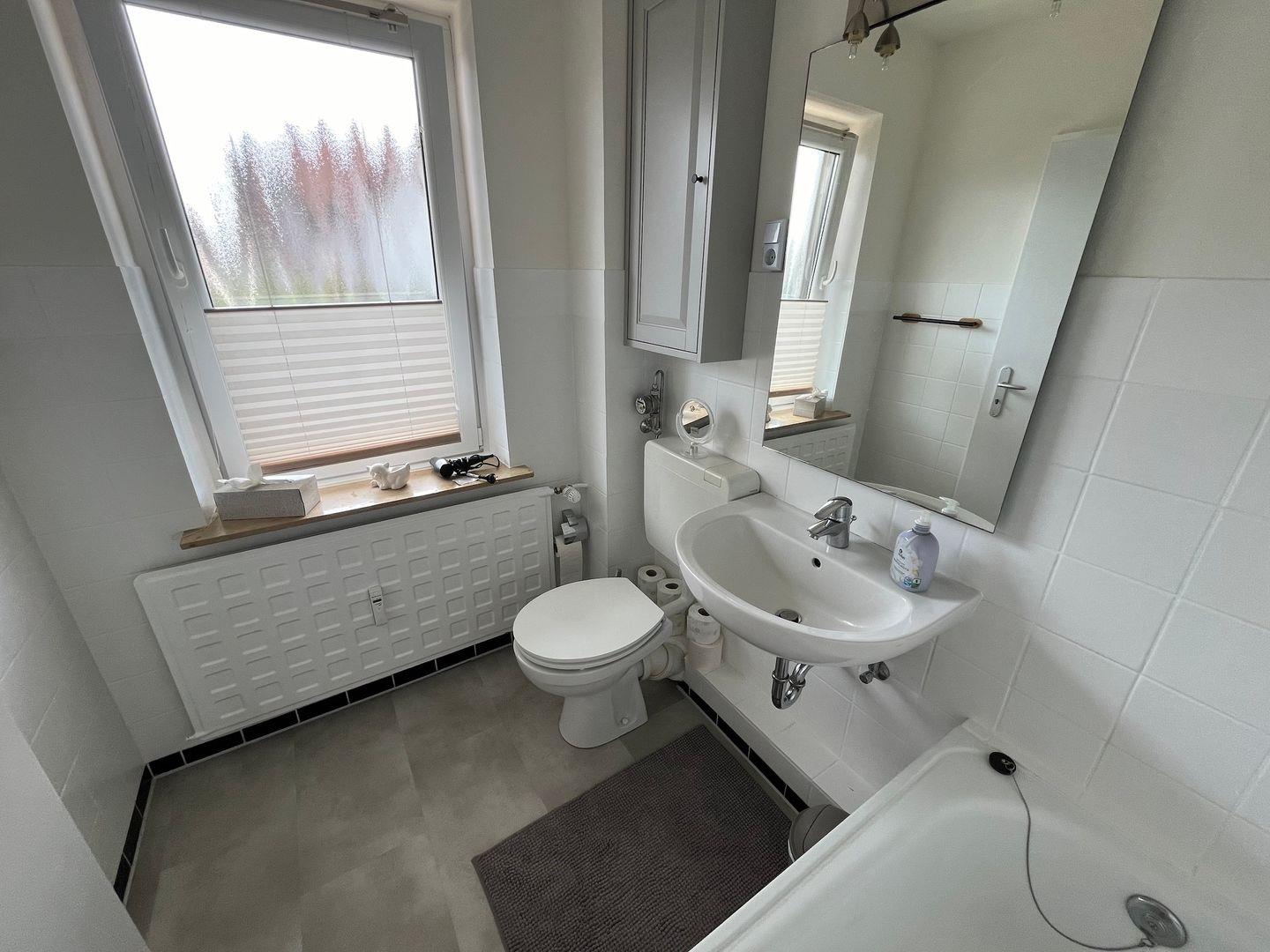 Das Badezimmer verfügt über eine Badewanne mit WC und Waschtisch, ein Fenster ist vorhanden