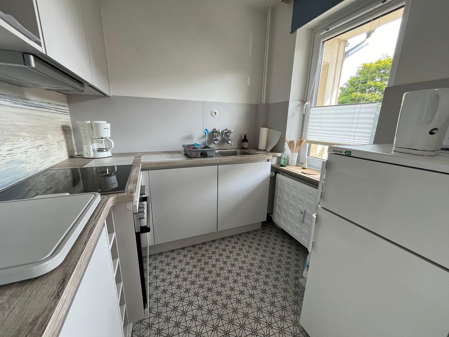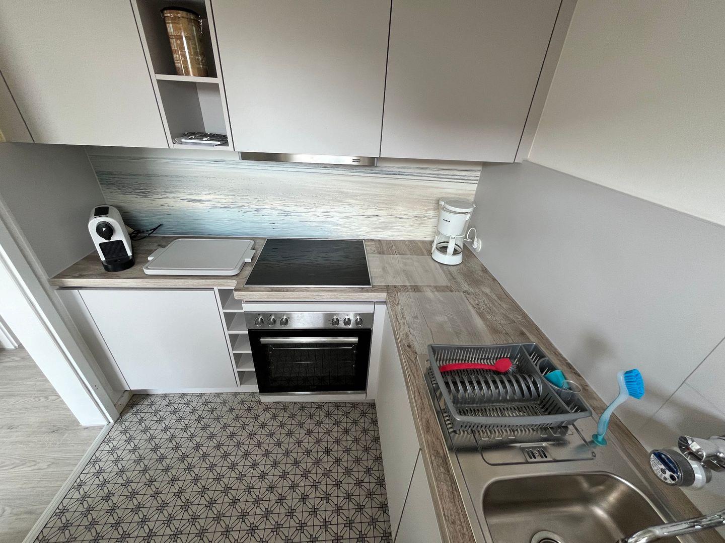 Modern präsentiert sich auch die gut ausgestattete Küche mit Cerankochfeld, Backofen und Kühlschrank mit Gefrierfach (keine Spülmaschine), von hier haben Sie auch einen tollen Blick ins Getümmel von Grömitz.
