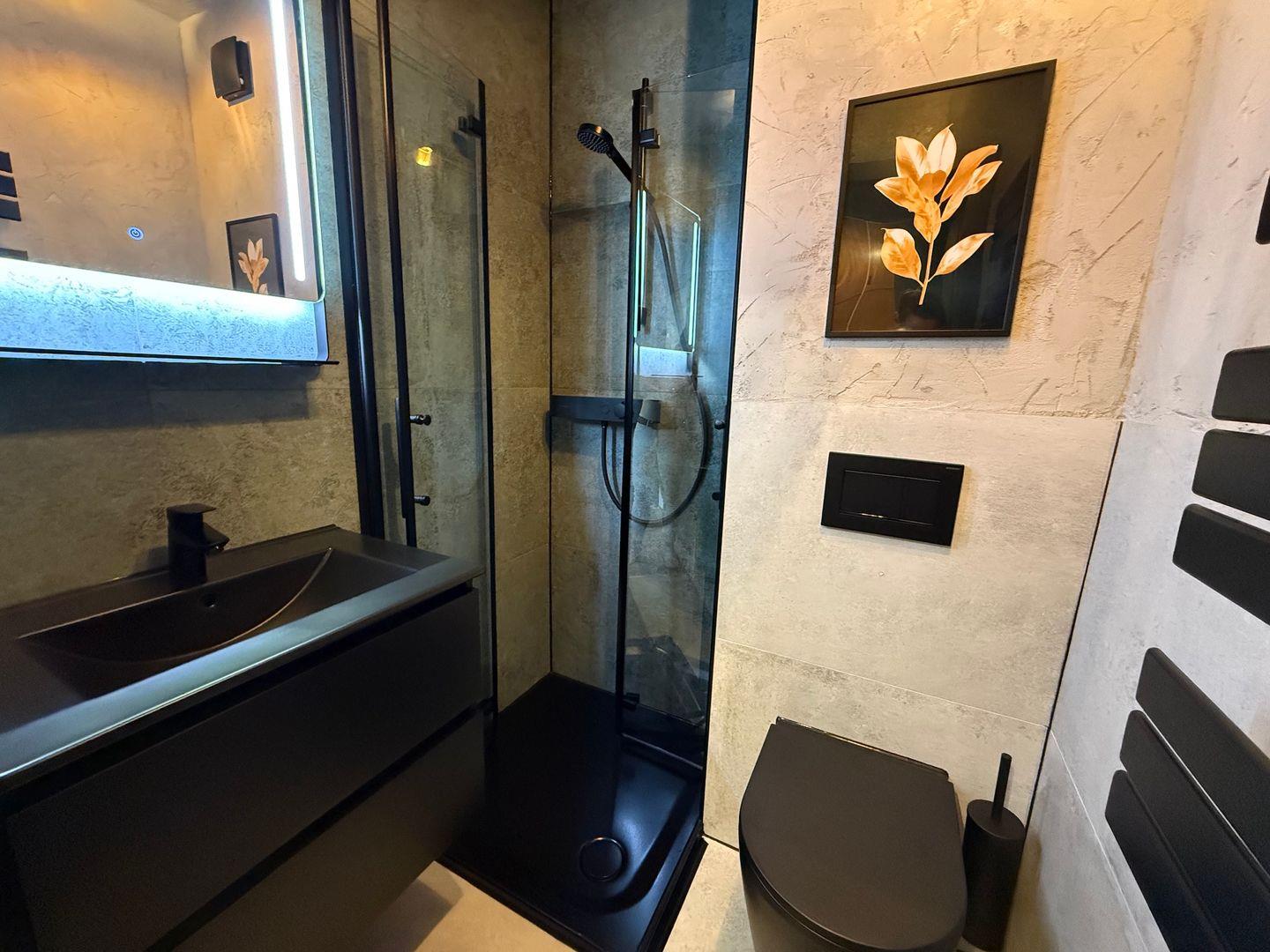 Das moderne Badezimmer ausgestattet mit einer Dusche (80cmx80cm) mit flachem Einstieg, sowie einem modernen Design Handtuchheizkörper, beleuchtetem Antibeschlag Spiegel und Waschtisch mit passendem Unterschrank und Föhn, sowie Kosmetik Spiegel.