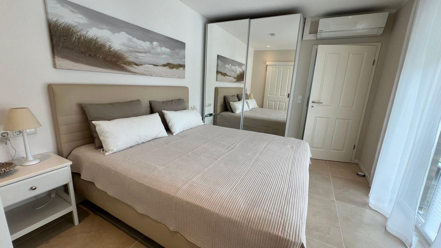 Vom Flur aus gelangen Sie auch in das kleinere Schlafzimmer, mit großem Doppelbett und ebenfalls mit Bad en suite, ideal für Ihre Kinder jeden Alters oder zwei weitere Erwachsene. Auch dieses Schlafzimmer lässt sich durch die elektrischen Fenster-Jalousien vollständig verdunkeln und verfügt über einen 32 Zoll großen Sony Fernseher, einen eigenen Kleiderschrank und Schuhschrank.