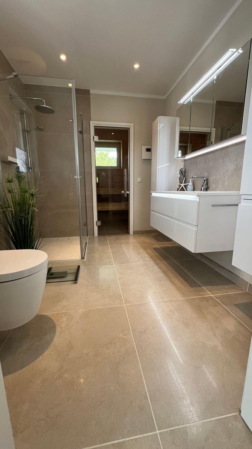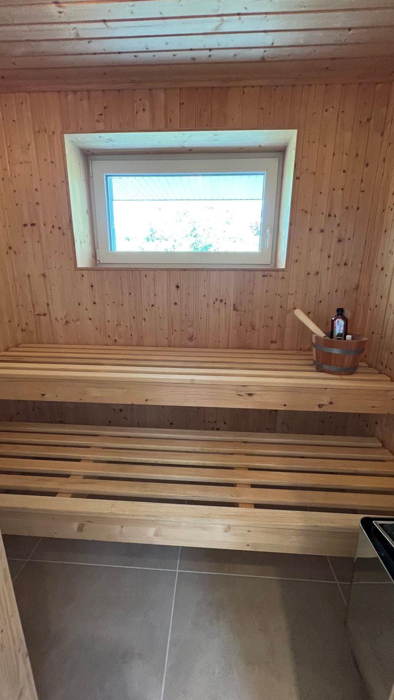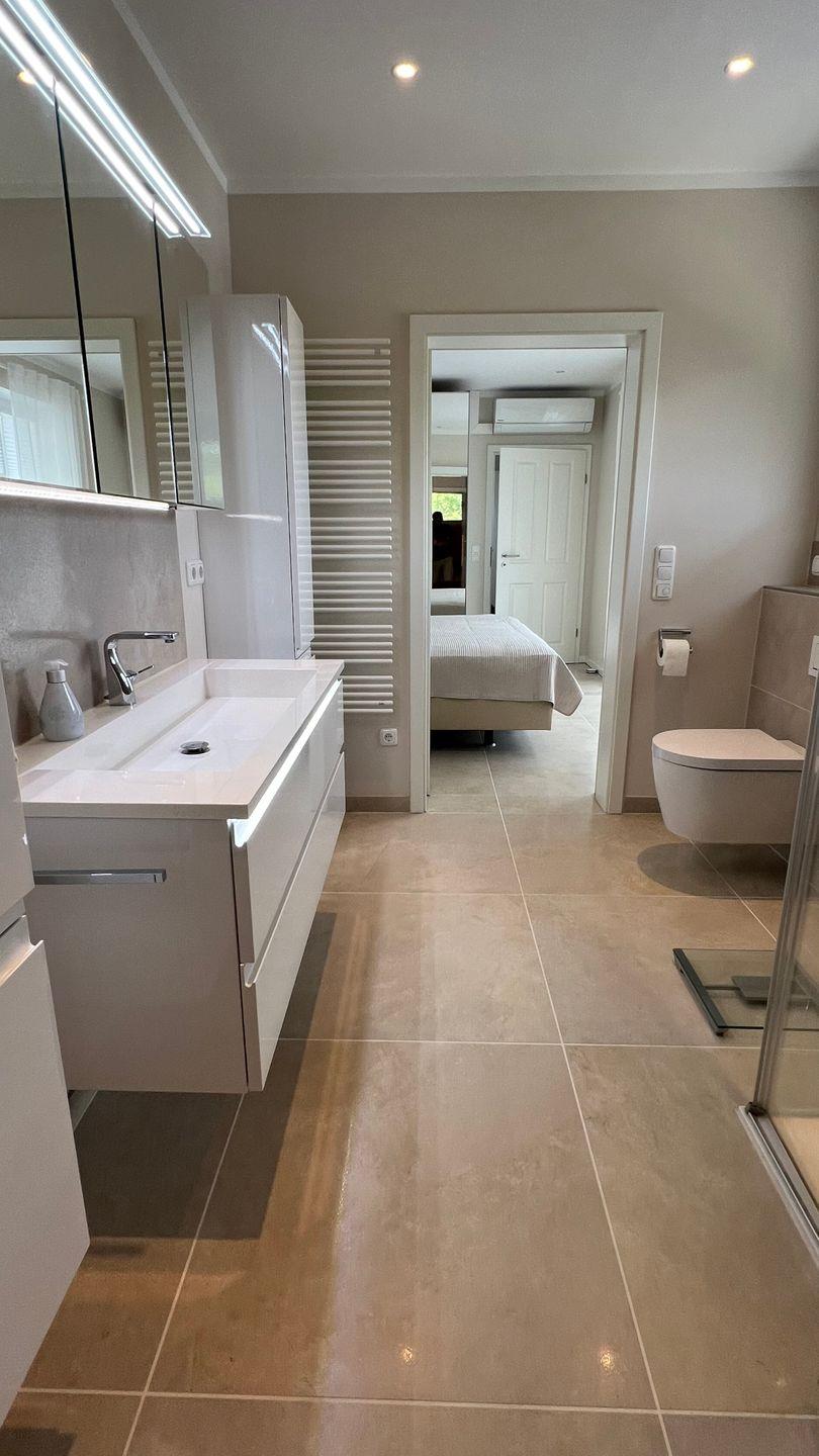 Vom Flur aus gelangen Sie in das Schlafzimmer mit Bad en suite und Regendusche, in dem sich auch eine Sauna für bis zu vier Personen befindet. Das besondere Extra der Sauna: ein Fenster mit direktem Blick in den Kurpark! Das Schlafzimmer ist für die heißen Tage mit einer Klimaanlage ausgestattet und lässt sich durch die elektrischen Fenster-Jalousien vollständig verdunkeln. Außerdem befinden sich mehrere Plissees an den bodentiefen Schlafzimmerfenstern, sodass auch bei geöffneten Jalousien kein Einblick von außen möglich ist.