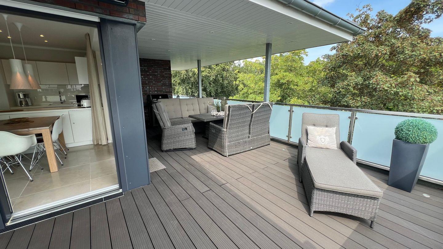 Perfekte Erholung in ruhiger Lage mit absoluter Privatsphäre im top ausgestatteten Penthouse mit traumhaftem Blick auf die Baumkronen des Grömitzer Kurparks zur einen Seite der 52qm großen Dachterrasse und zur anderen Seite auf das Hotel Carat und die Ostsee.