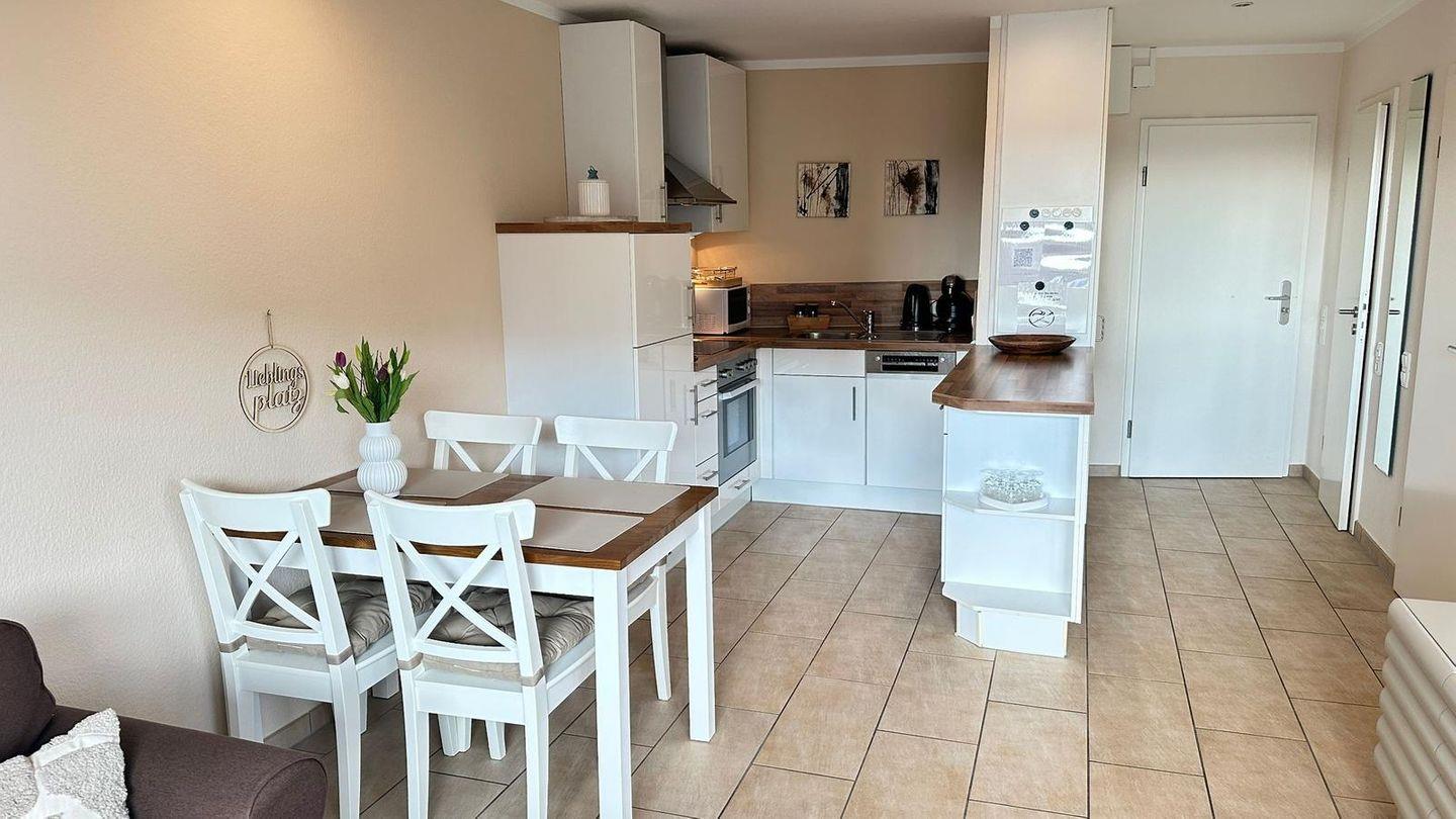 Der gemütliche Wohn- und Essbereich bildet das Herzstück der Ferienwohnung. Hier lässt sich abends ein gemütlicher Fernsehabend auf dem Sofa verbringen oder Sie genießen einfach den fantastischen Ausblick zur Ostsee. Hier befindet sich auch ein Schlafsofa und der Zugang zum überdachten Balkon in Süd-West Lage.