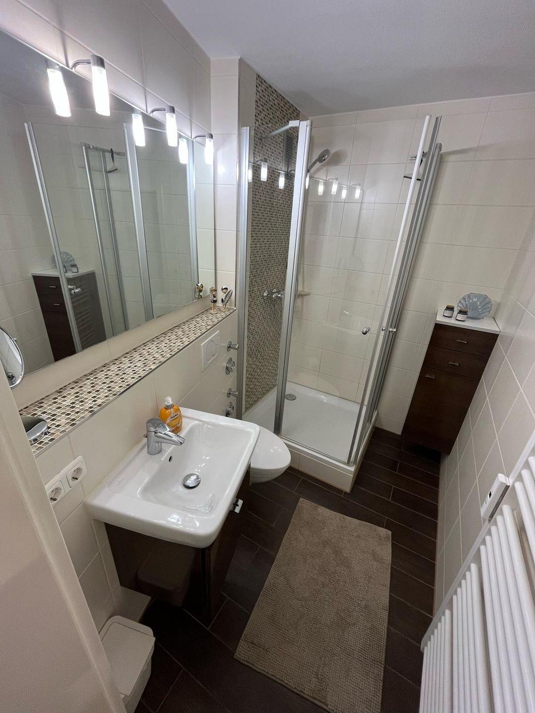 Das moderne Badezimmer ist mit einer Dusche, Waschbecken, WC und Handtuchheizkörper ausgestattet.