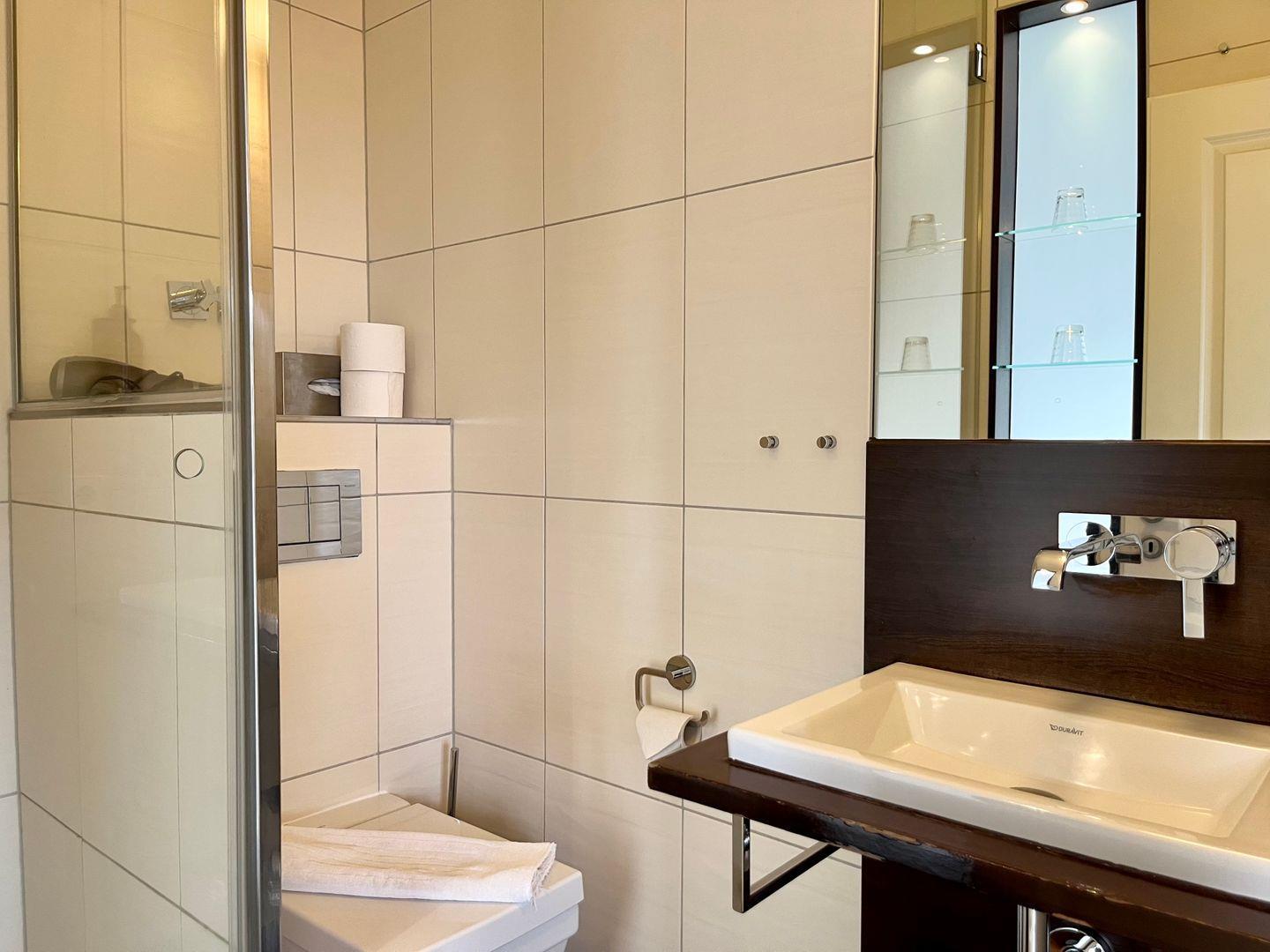 Komfortables 1-Zimmer-Apartment (25 m²) im 2. Stock für 2 Personen mit Sitzecke, Küchenzeile, Tresen, Ceranfeld, Bad mit Dusche und Balkon. Optional kann ein Frühstück hinzugebucht werden.