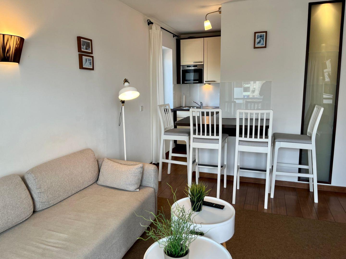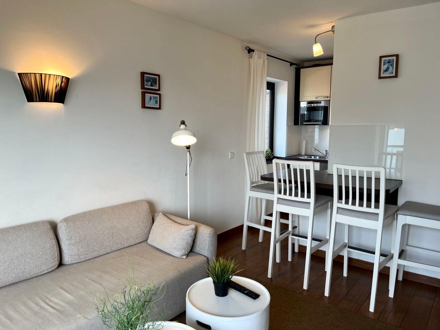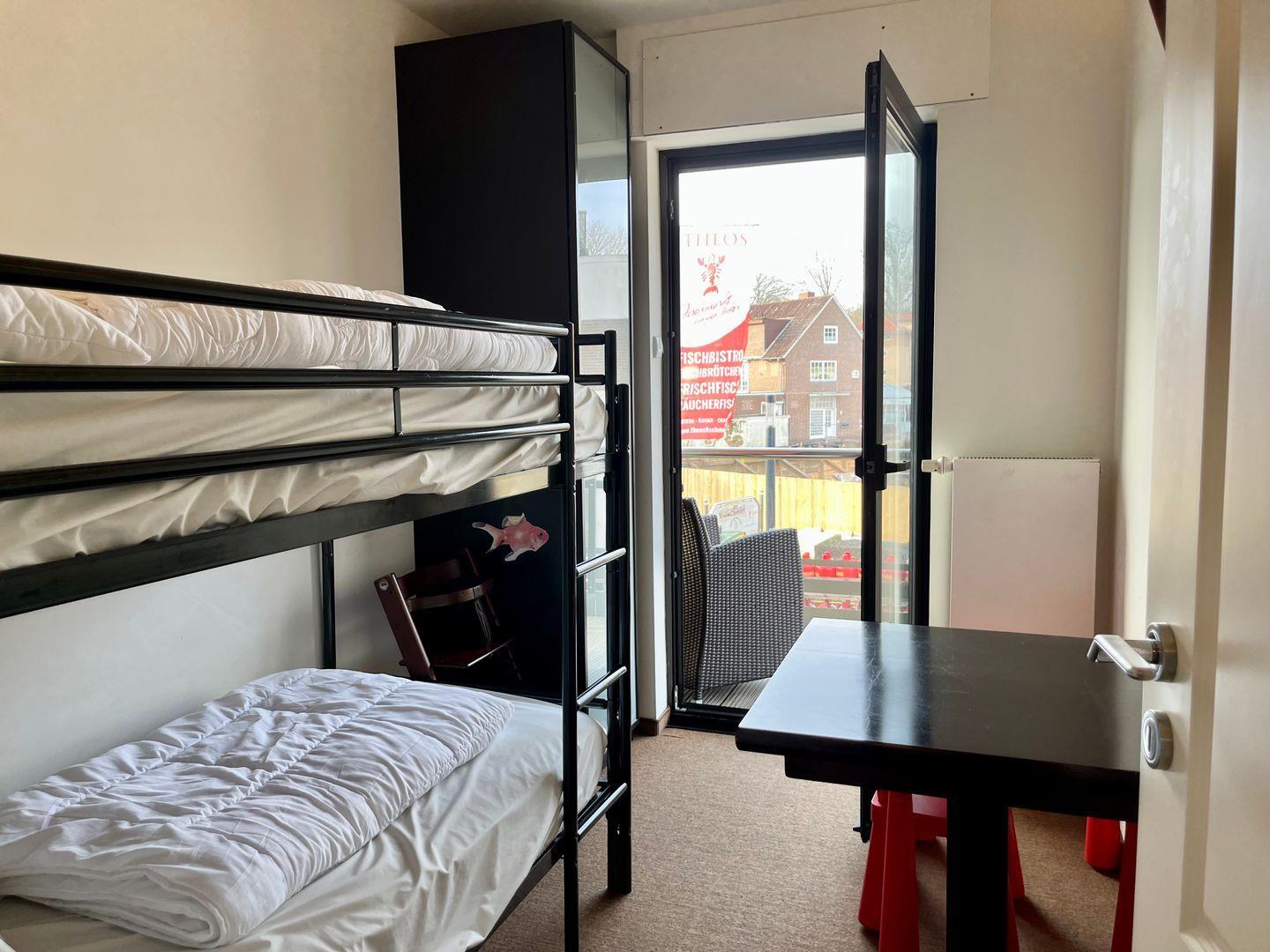 Die 3-Zimmer-Wohnung im 1. Stock bietet auf 55 m² ausreichend Platz für bis zu 4 Personen. Sie verfügt über einen Balkon, eine Küchenzeile mit 2-Platten-Ceranfeld und Tresen mit Sitzbereich. Das Schlafzimmer ist mit einem Doppelbett ausgestattet, während das zweite Schlafzimmer ein Etagenbett sowie einen Schreibtisch bietet. Vom zweiten Schlafzimmer sowie dem Wohnbereich aus haben Sie Zugang zum Balkon.