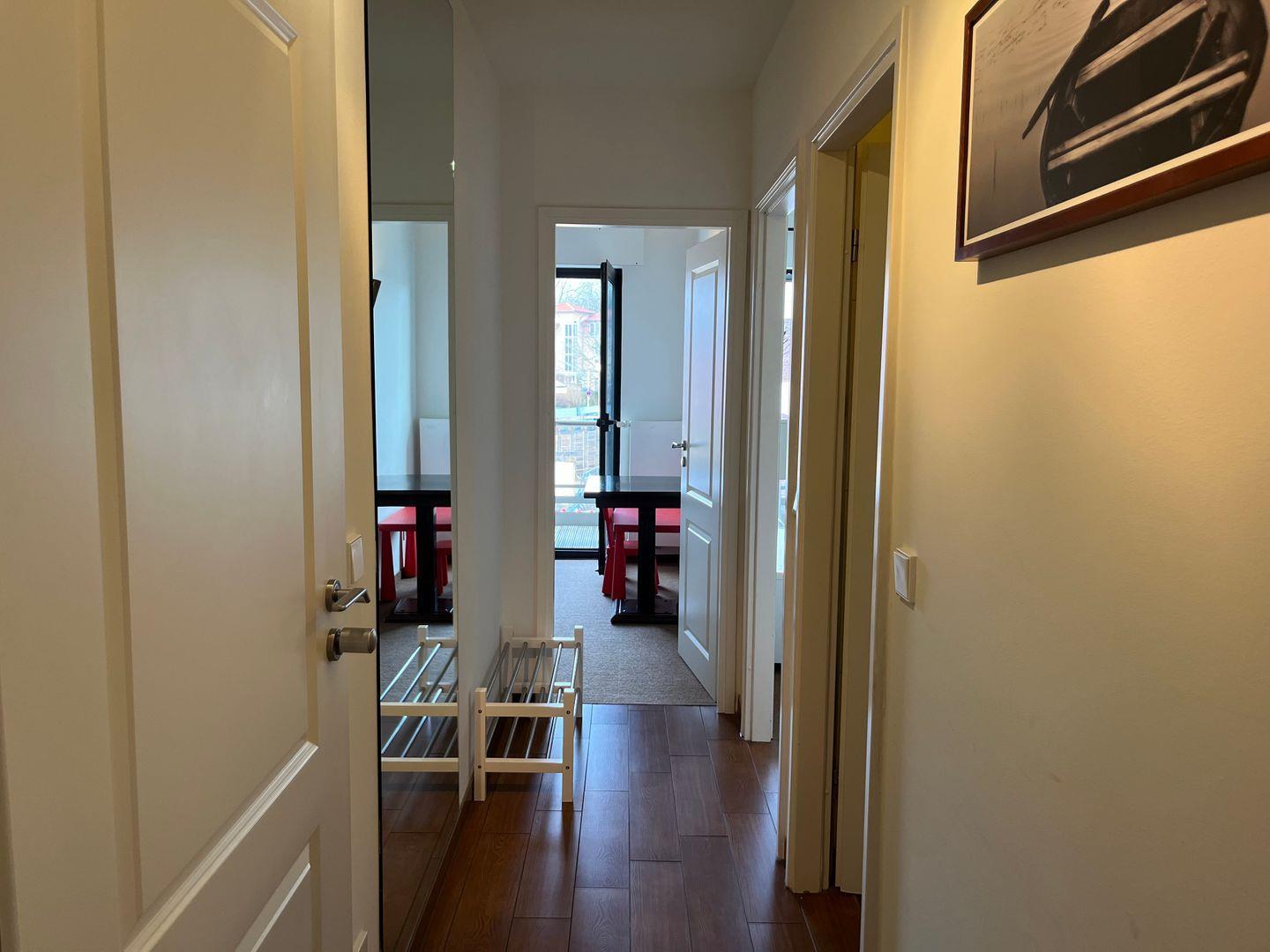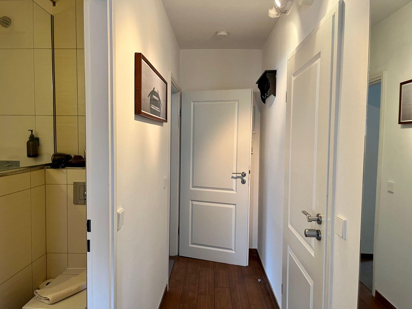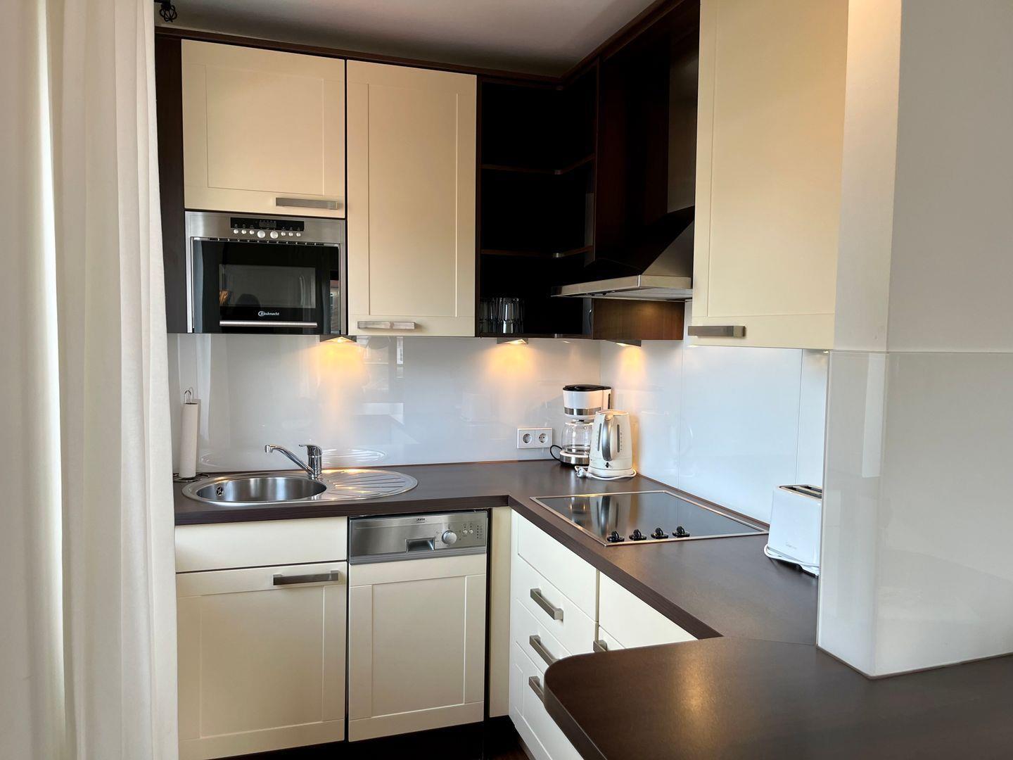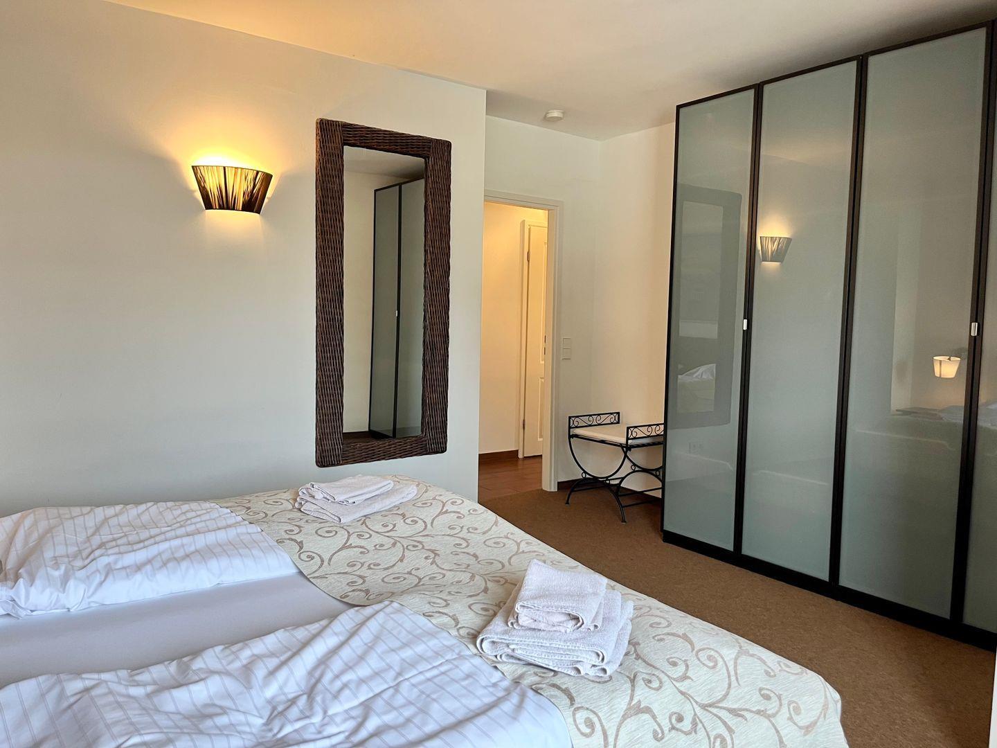 Die 3-Zimmer-Wohnung im 1. Stock bietet auf 55 m² ausreichend Platz für bis zu 4 Personen. Sie verfügt über einen Balkon, eine Küchenzeile mit 2-Platten-Ceranfeld und Tresen mit Sitzbereich. Das Schlafzimmer ist mit einem Doppelbett ausgestattet, während das zweite Schlafzimmer ein Etagenbett sowie einen Schreibtisch bietet. Vom zweiten Schlafzimmer sowie dem Wohnbereich aus haben Sie Zugang zum Balkon.
