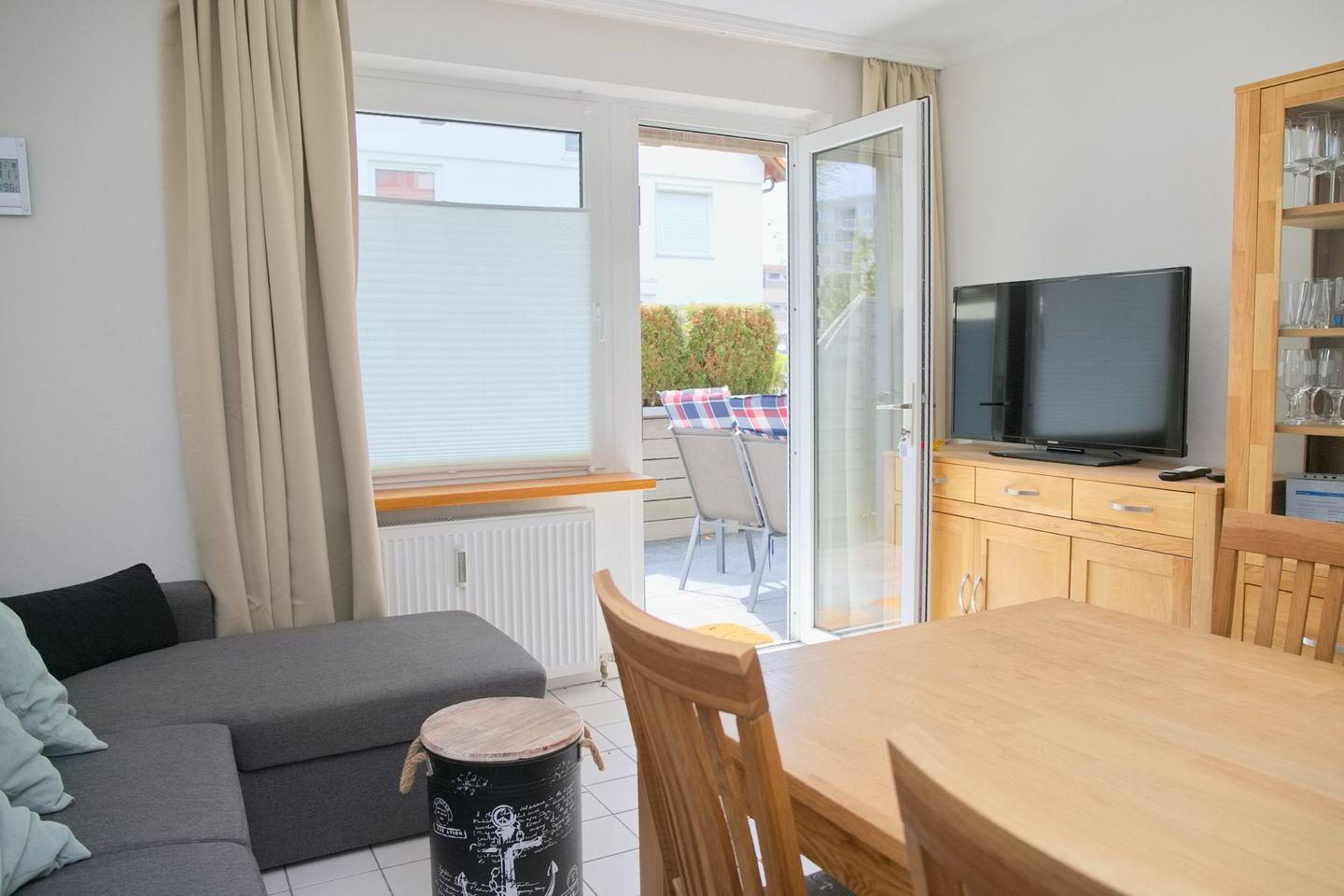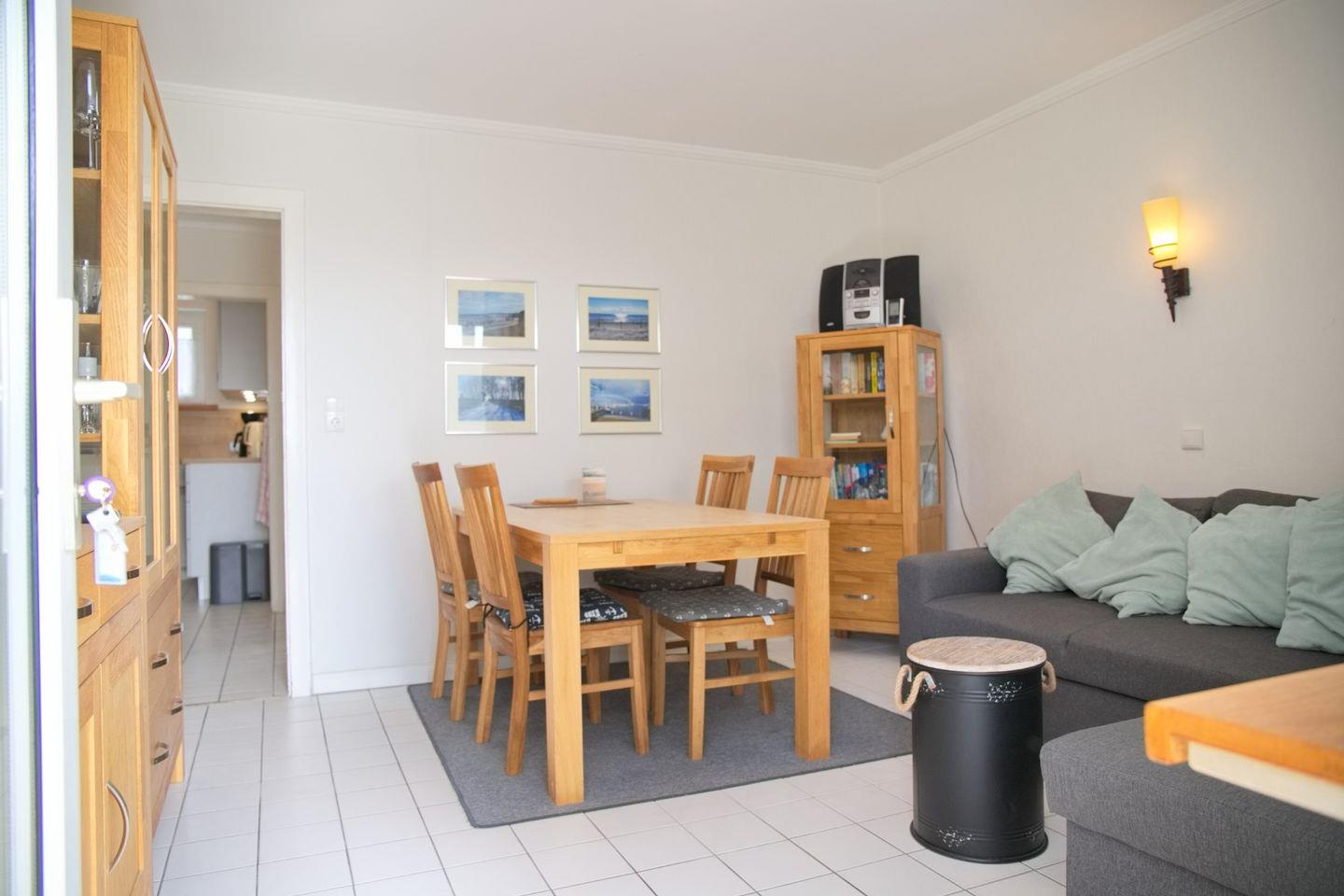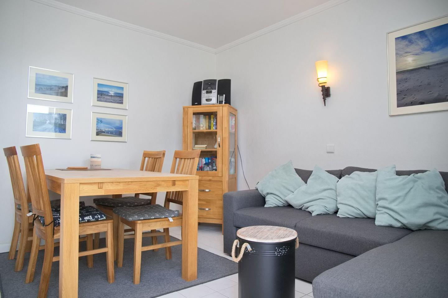 Die Ferienwohnung in Grömitz verfügt über ein einladendes Wohnzimmer mit einer bequemen Eckcouchgarnitur, Magenta-TV sowie Radio und CD-Player – perfekt für entspannte Abende nach einem sonnigen Tag am Meer. Der angrenzende Essbereich bietet Platz für vier Personen und lädt zu gemeinsamen Mahlzeiten ein. Die separate Küche ist voll ausgestattet mit Mikrowelle inklusive Backfunktion, Cerankochfeld, Geschirrspüler, Kühlschrank mit Gefrierfach, Wasserkocher, Toaster und Kaffeemaschine – hier könnt ihr euch bequem selbst versorgen.