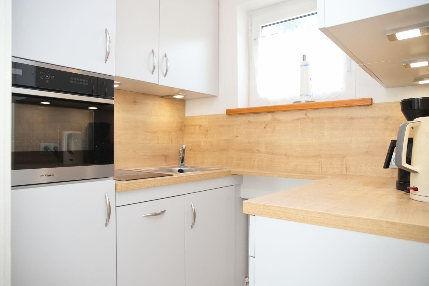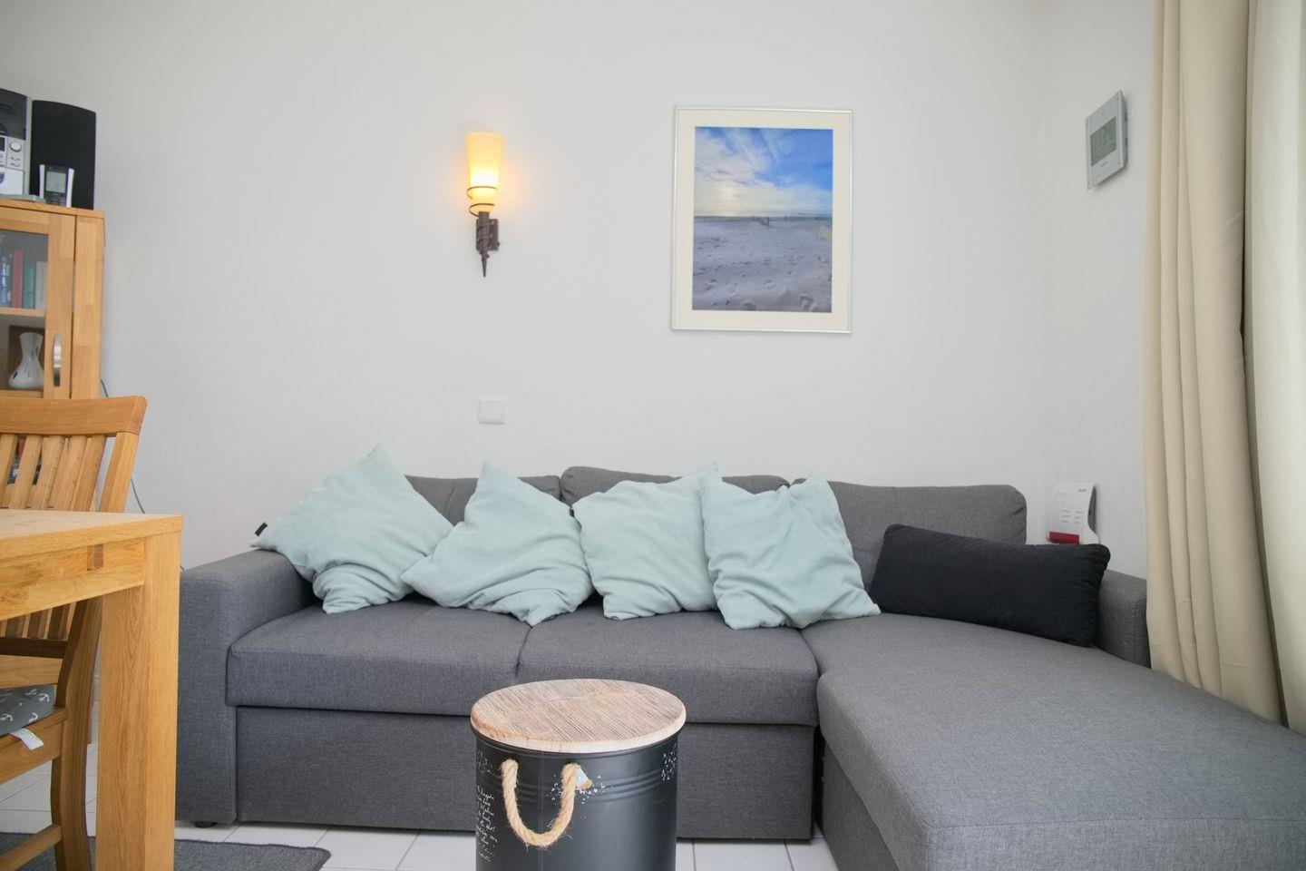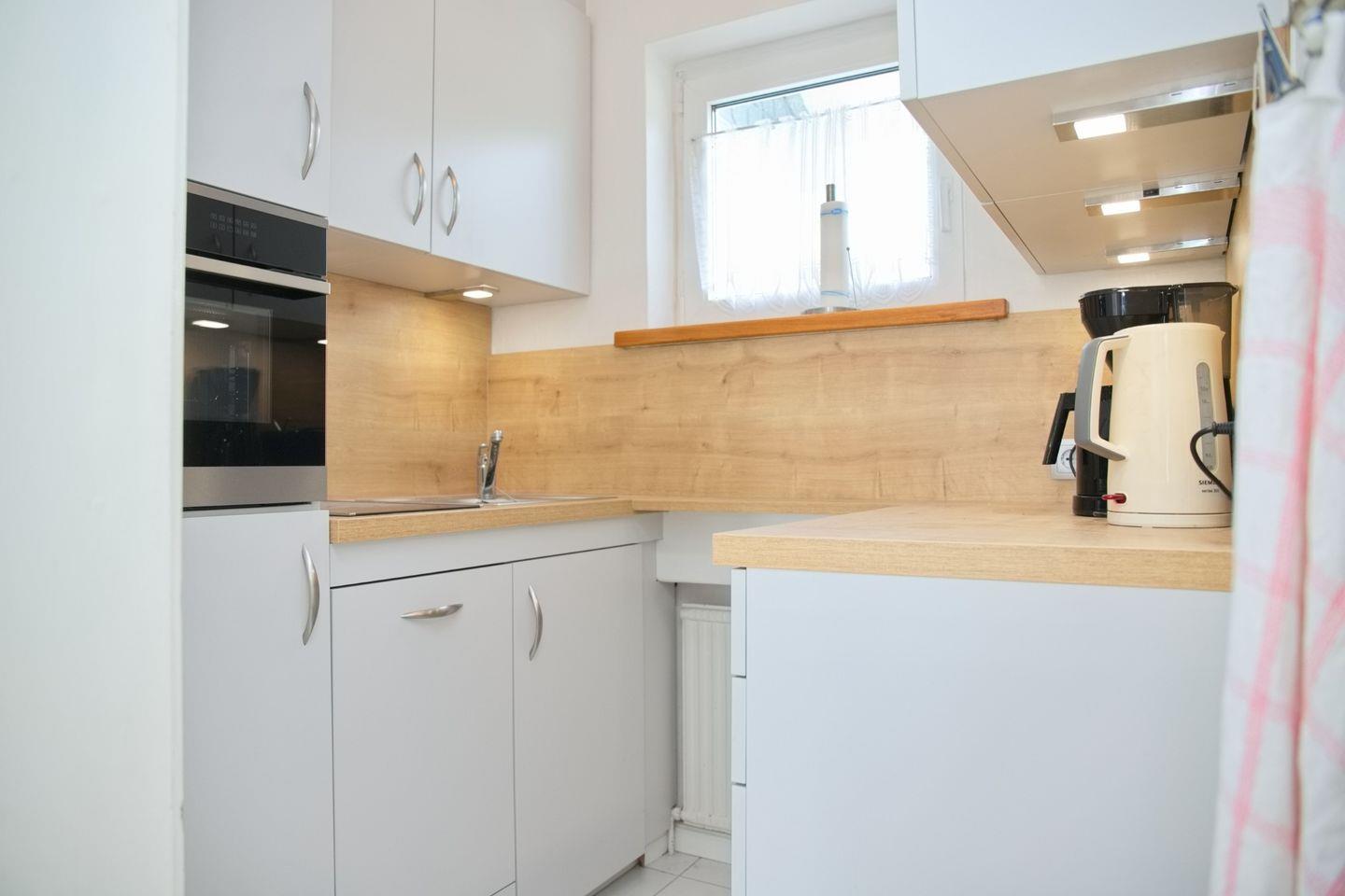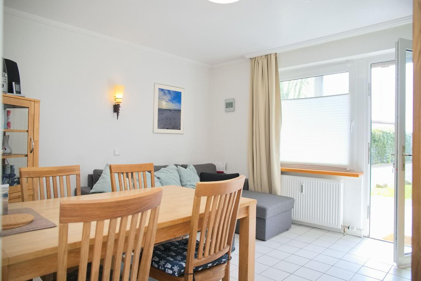 Die Ferienwohnung in Grömitz verfügt über ein einladendes Wohnzimmer mit einer bequemen Eckcouchgarnitur, Magenta-TV sowie Radio und CD-Player – perfekt für entspannte Abende nach einem sonnigen Tag am Meer. Der angrenzende Essbereich bietet Platz für vier Personen und lädt zu gemeinsamen Mahlzeiten ein. Die separate Küche ist voll ausgestattet mit Mikrowelle inklusive Backfunktion, Cerankochfeld, Geschirrspüler, Kühlschrank mit Gefrierfach, Wasserkocher, Toaster und Kaffeemaschine – hier könnt ihr euch bequem selbst versorgen.