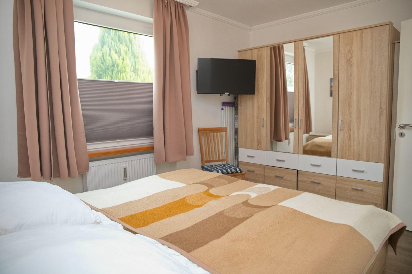 Das gemütliche Hauptschlafzimmer ist mit einem Doppelbett (2x 90x200 cm), einem geräumigen Kleiderschrank und einem Magenta-TV ausgestattet. Zudem gibt es ausreichend Platz für ein Kinderbett. Das zweite Schlafzimmer bietet zwei Einzelbetten (je 90x200 cm) und eignet sich ideal für Kinder oder Freunde.
