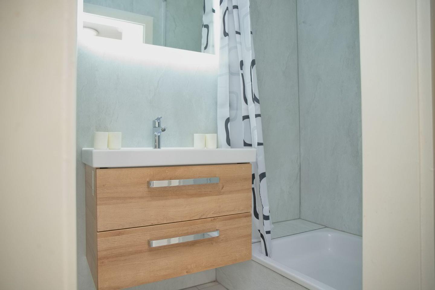 Das moderne Badezimmer der Ferienwohnung verfügt über eine Dusche, ein Waschbecken, einen Spiegelschrank mit Beleuchtung und einen Handtuchheizkörper. Zusätzlich gibt es ein separates WC mit Waschtisch und Spiegel – für noch mehr Komfort während eures Urlaubs an der Ostsee.