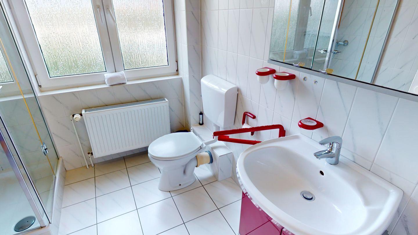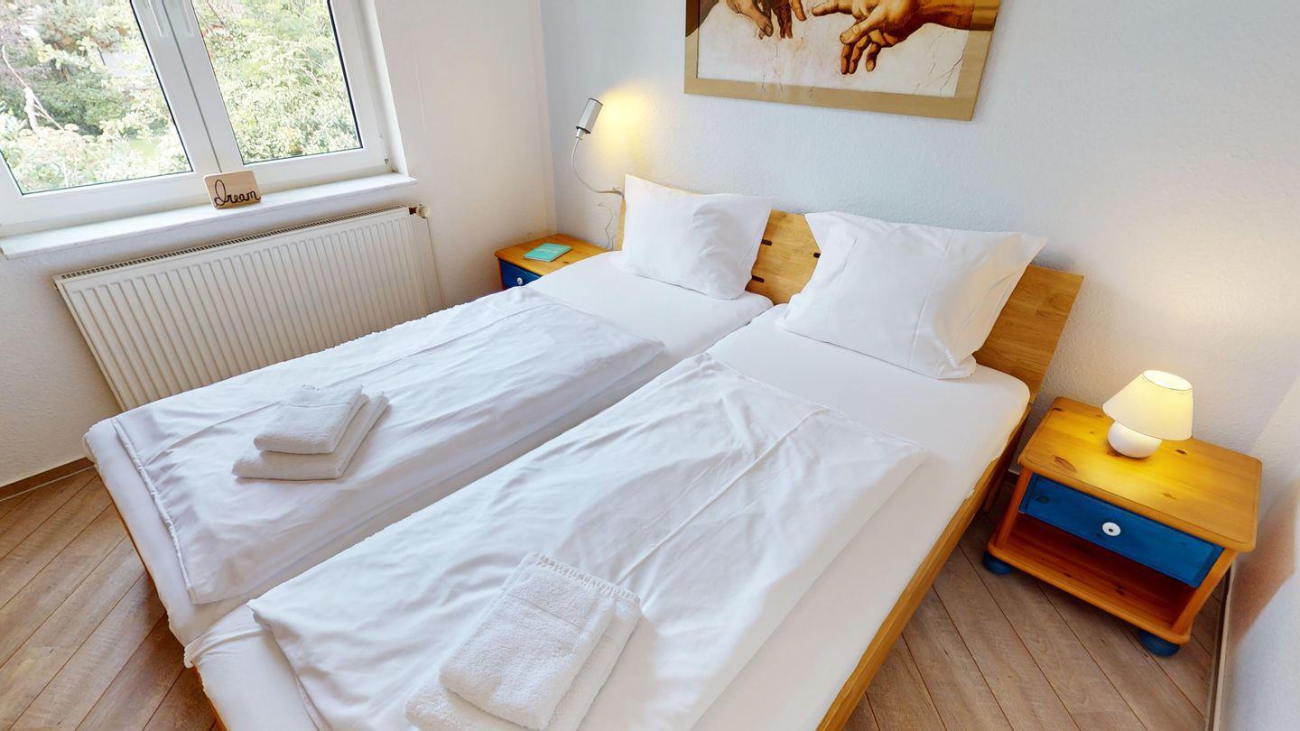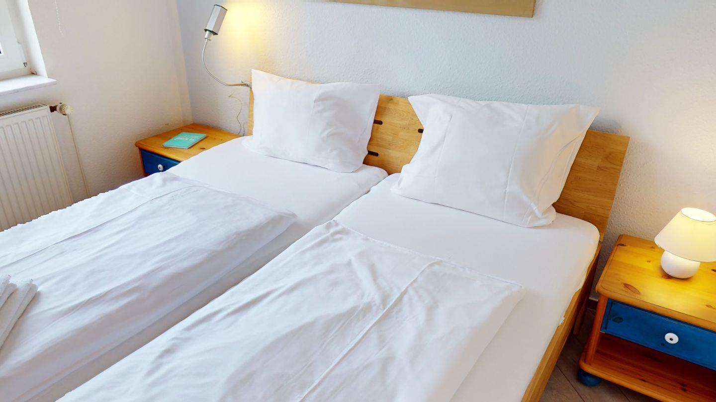 Ein Schlafzimmer verfügt über ein Doppelbett, das andere Schlafzimmer über zwei komfortable Einzelbetten. Ergänzt wird die Wohnung durch ein Duschbad mit WC.