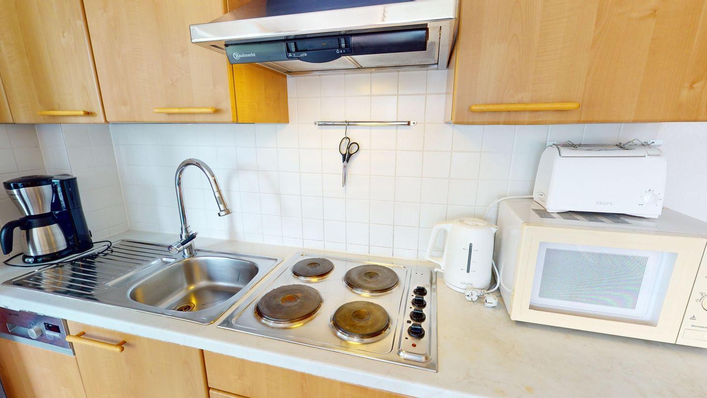 Der einladende Wohn-/Essbereich wird ergänzt durch die offene Küchenzeile mit einem farbenfrohen Essbereich. Von hier aus gelangen Sie zum möblierten Balkon, der Sie zu Schönen Stunden an der frischen Luft einlädt.