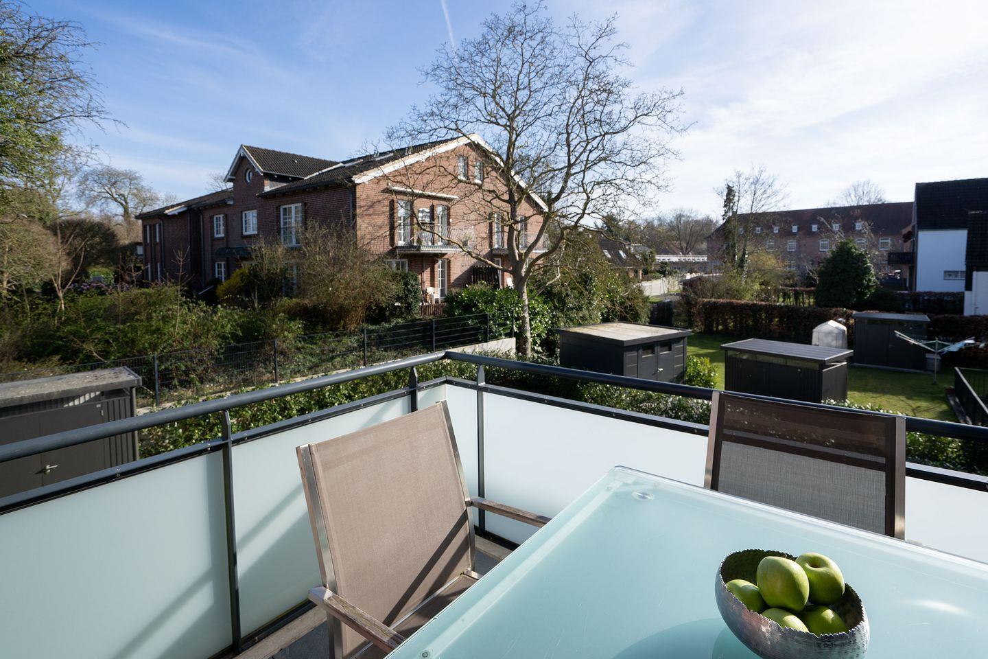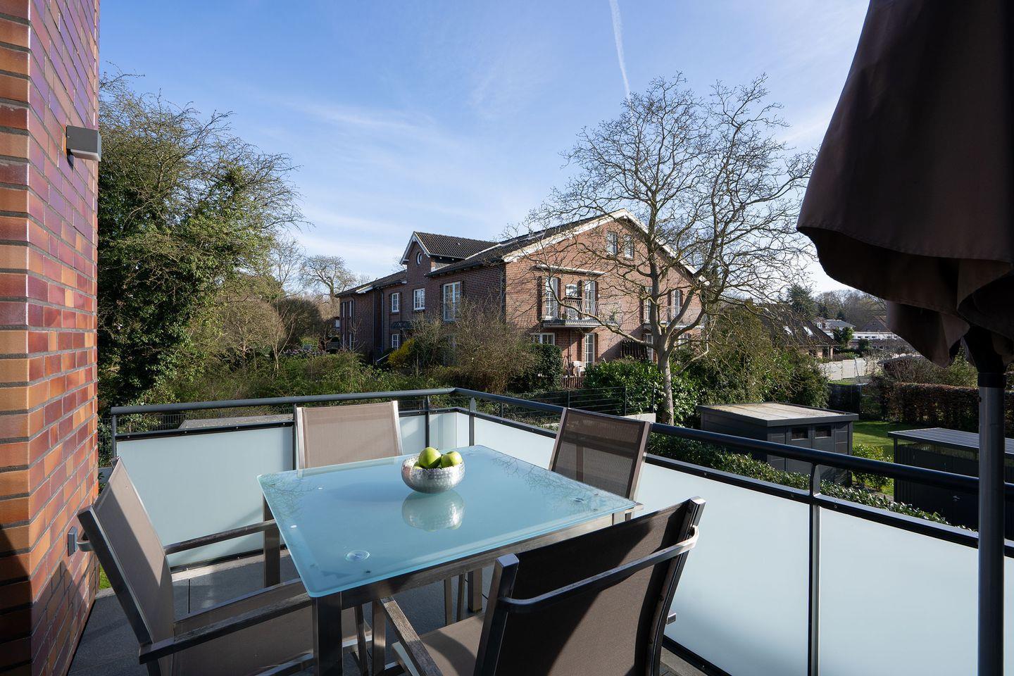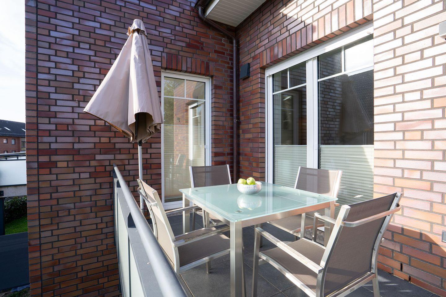 Ein weiteres Highlight ist der Balkon mit gemütlichen Gartenmöbeln – der perfekte Ort, um den Tag bei einer Tasse Kaffee am Morgen oder einem Glas Wein am Abend ausklingen zu lassen.