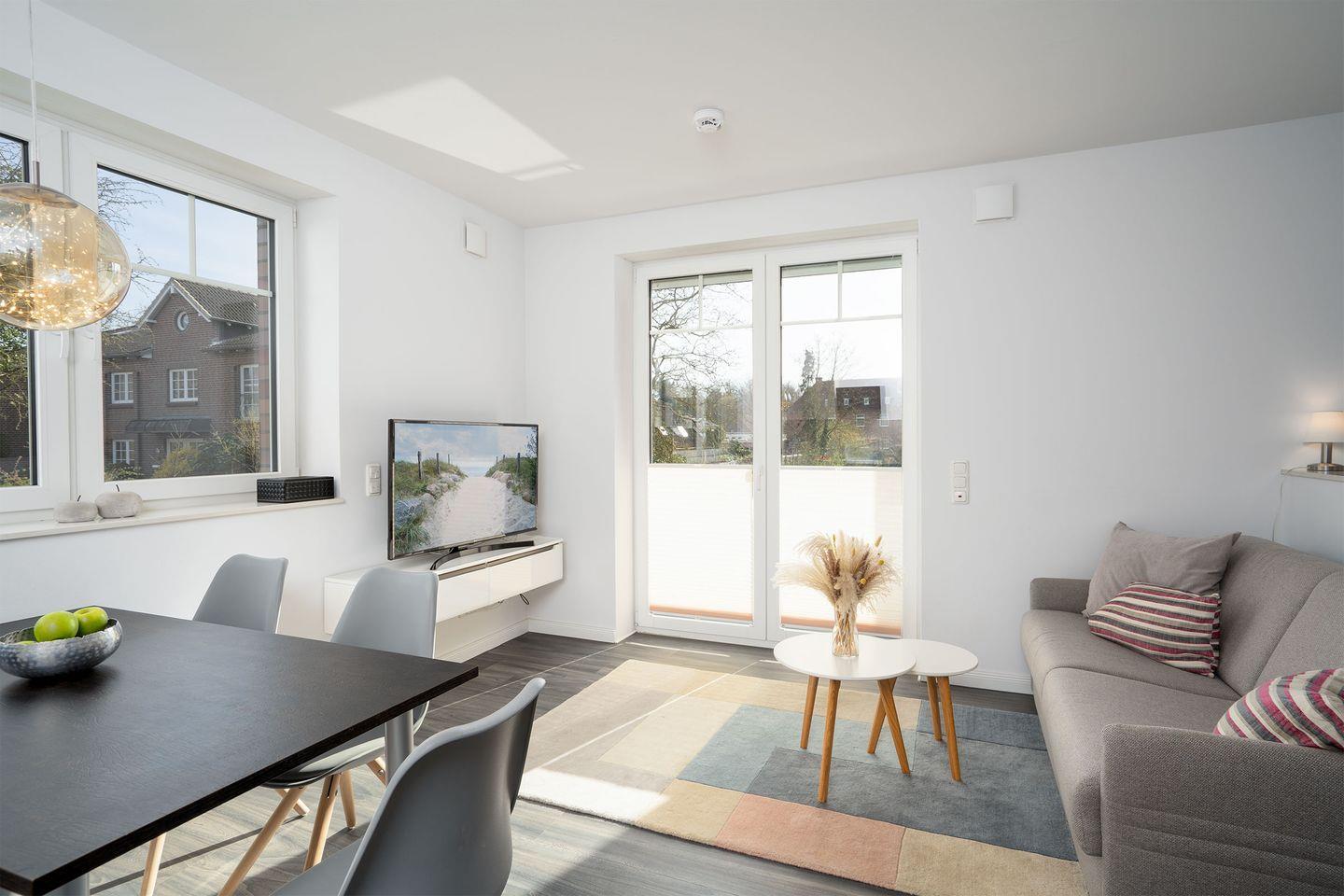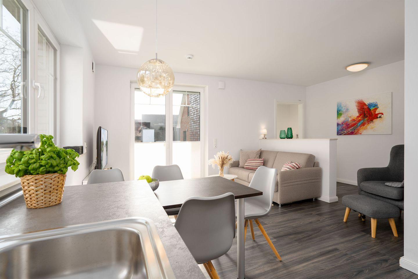 Gemütliche 50 m² Ferienwohnung für bis zu 4 Personen mit Schlafzimmer, Wohnbereich mit Schlafsofa, Sat-TV und WLAN. Die gut ausgestattete Küche bietet Spülmaschine, Herd, Kühlschrank, Wasserkocher und Toaster. Ein Balkon mit Gartenmöbeln lädt zum Verweilen ein. Die Wohnung liegt im 1. OG und ist bequem mit dem Fahrstuhl erreichbar.