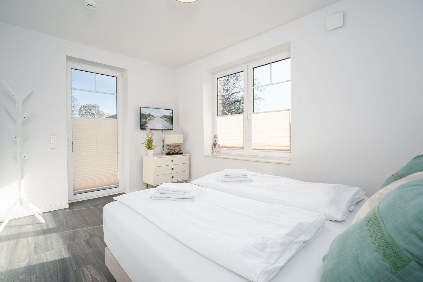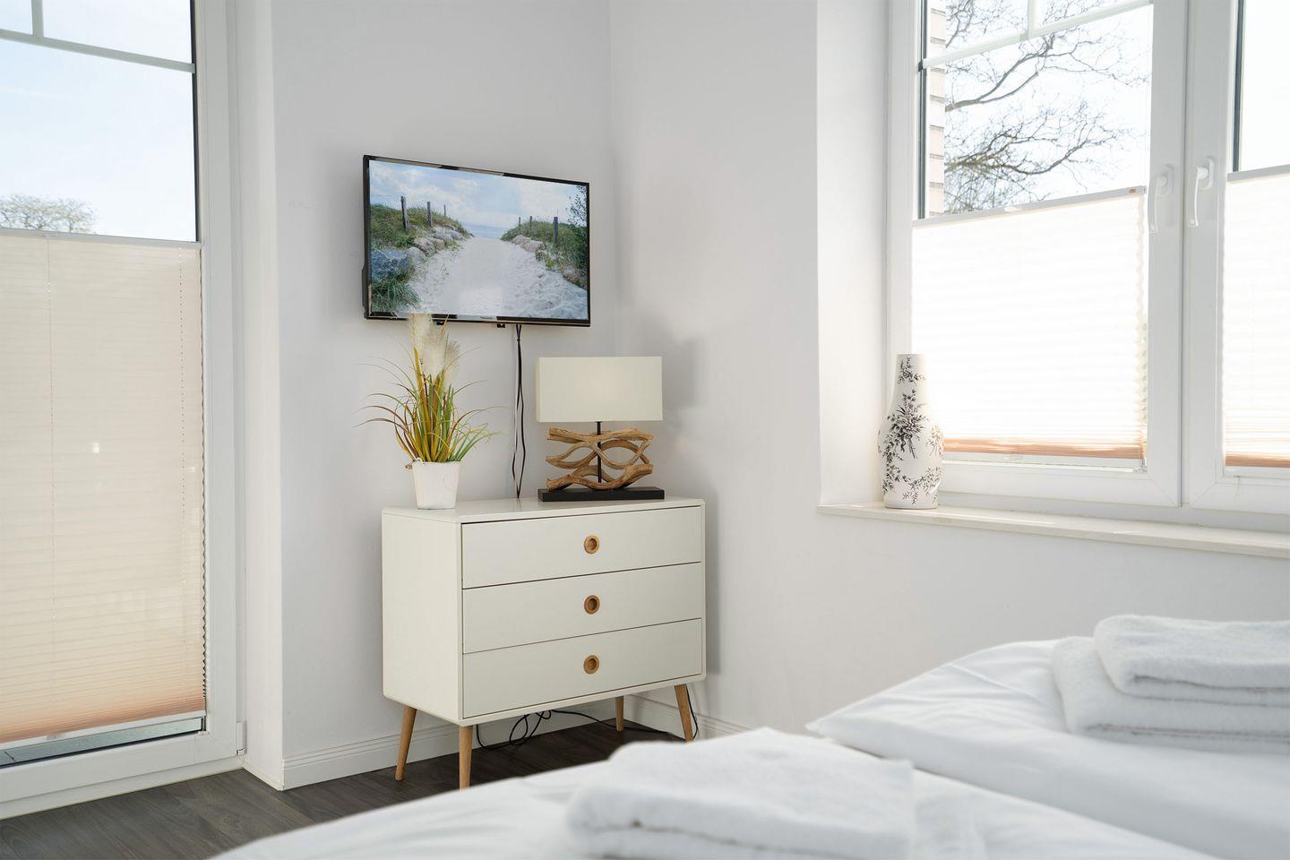 Das separate Schlafzimmer ist mit einem komfortablen Doppelbett ausgestattet, während das Wohnzimmer mit einem Schlafsofa zusätzlichen Platz für erholsame Nächte bietet. Dank Sat-TV, Radio und kostenfreiem WLAN müssen Sie auch im Urlaub nicht auf Unterhaltung verzichten.