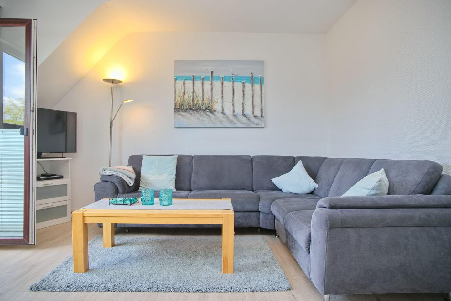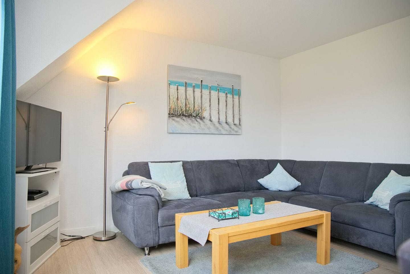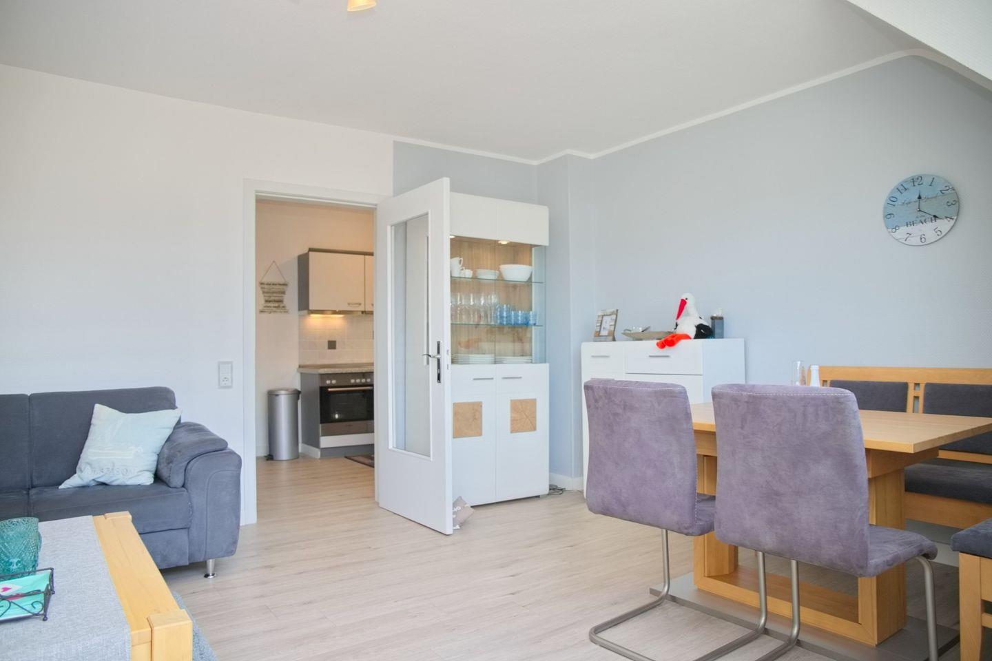 Die Wohnung verfügt über insgesamt drei Zimmer, darunter zwei komfortable Schlafzimmer, die mit hochwertigen Betten ausgestattet sind und zu erholsamen Nächten einladen. Das geräumige Wohnzimmer bietet mit einer Sofaecke und einem Essbereich ausreichend Platz für gemeinsame Stunden. Ein TV sowie ein CD-Spieler und Radio sorgen für unterhaltsame Abende.