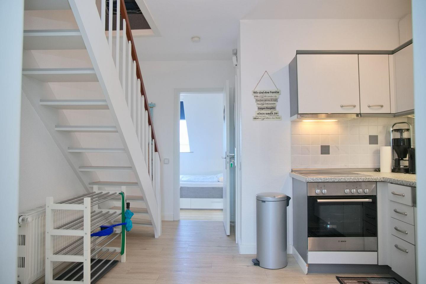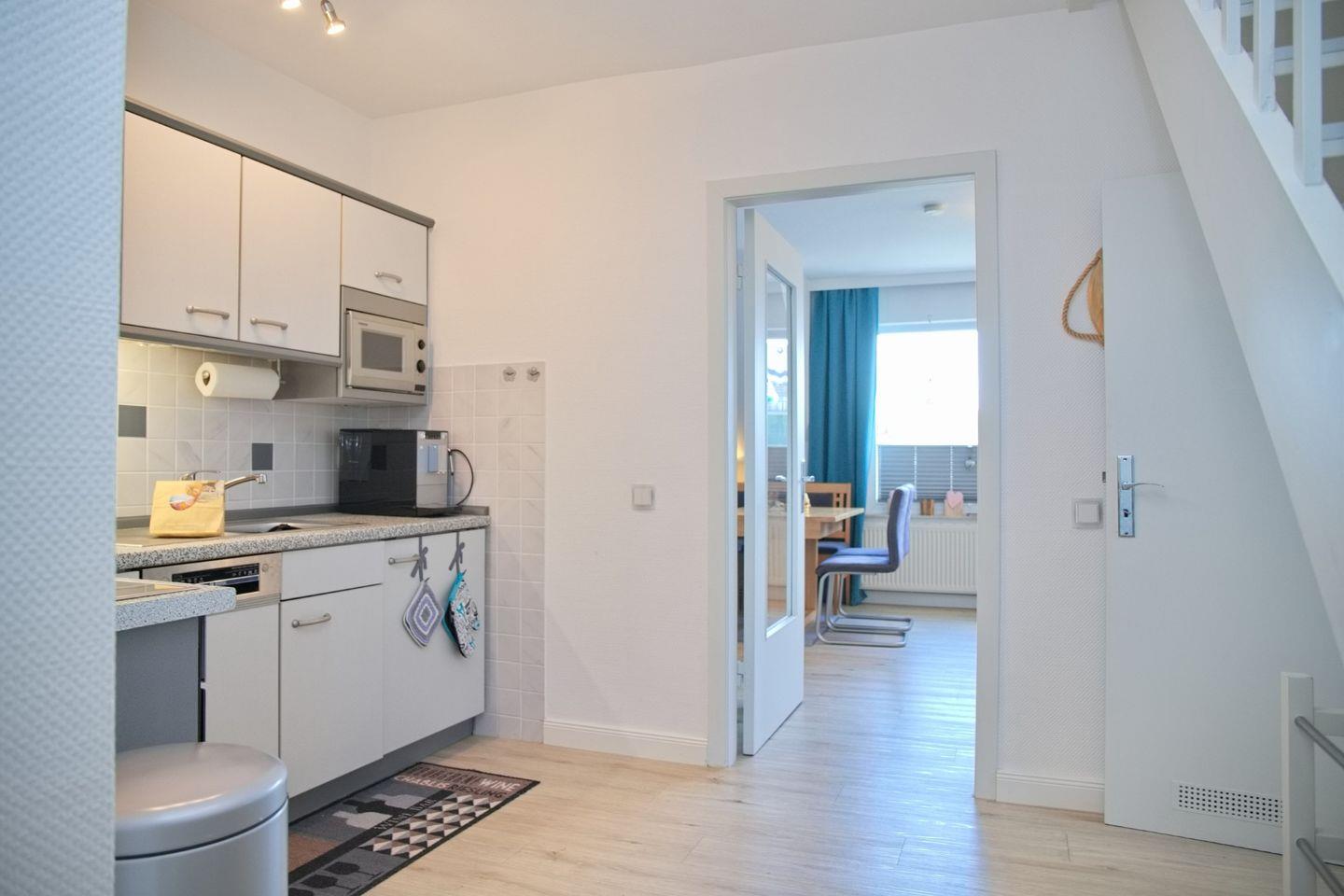 Die voll ausgestattete, separate Küche erfüllt alle Wünsche für die Zubereitung köstlicher Mahlzeiten. Sie ist mit modernen Geräten wie einem Cerankochfeld, Backofen, Mikrowelle, Kühlschrank mit Gefrierfach und einer Spülmaschine ausgestattet. Küchenausstattung wie Wasserkocher, Toaster und Kaffeemaschine runden das optimale Kocherlebnis ab.