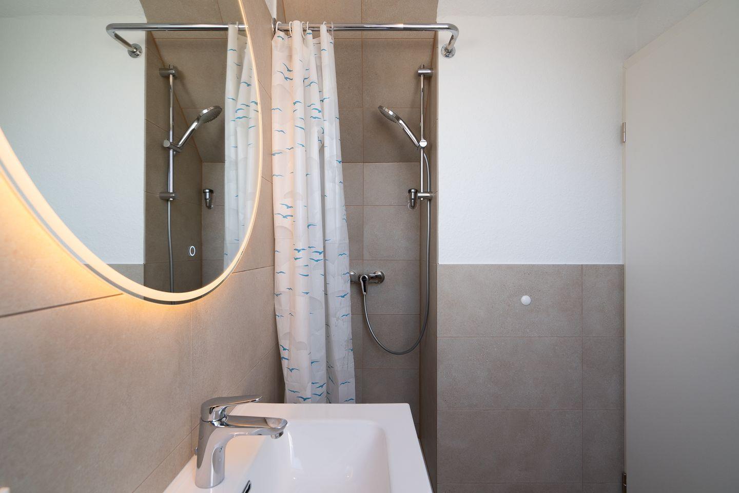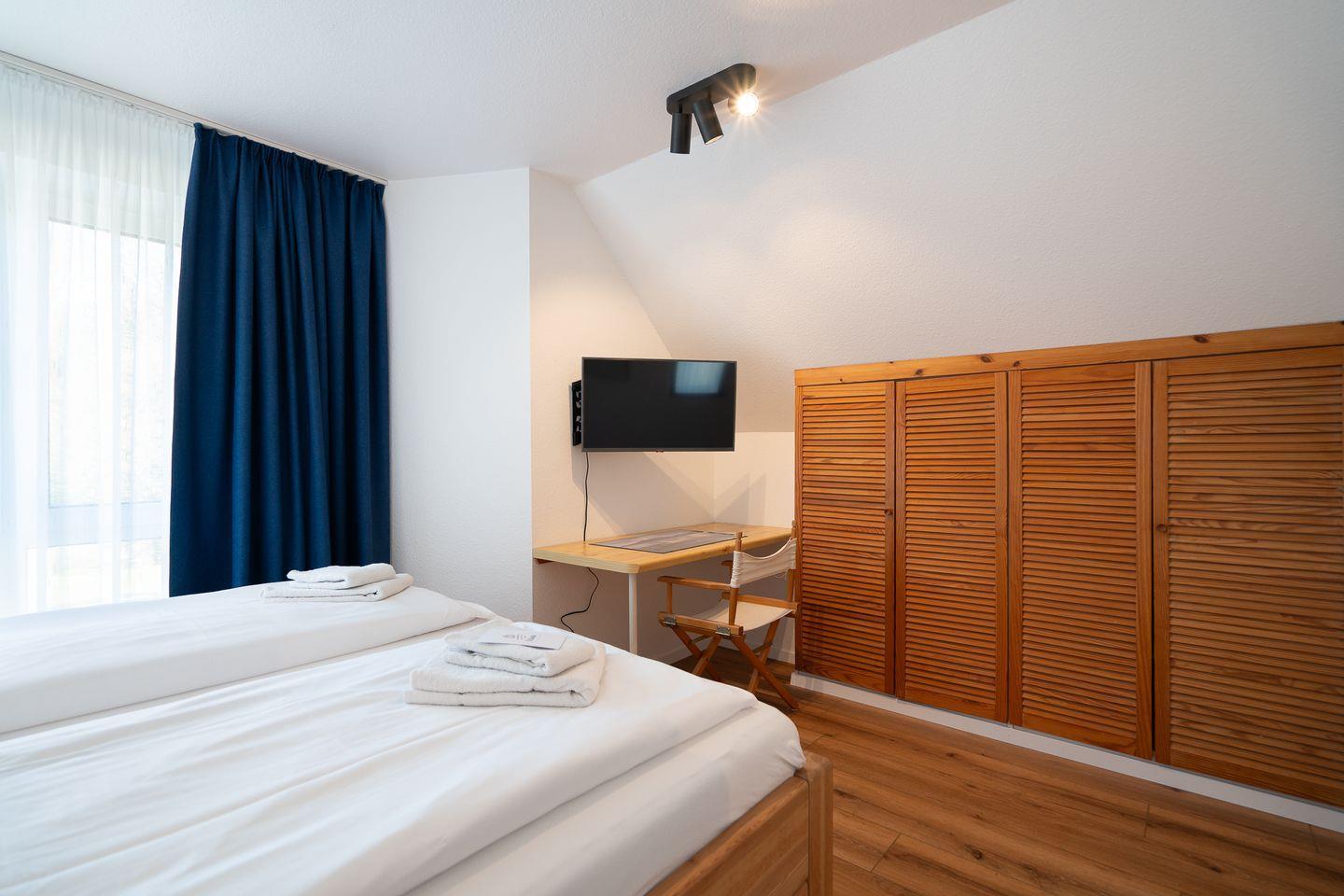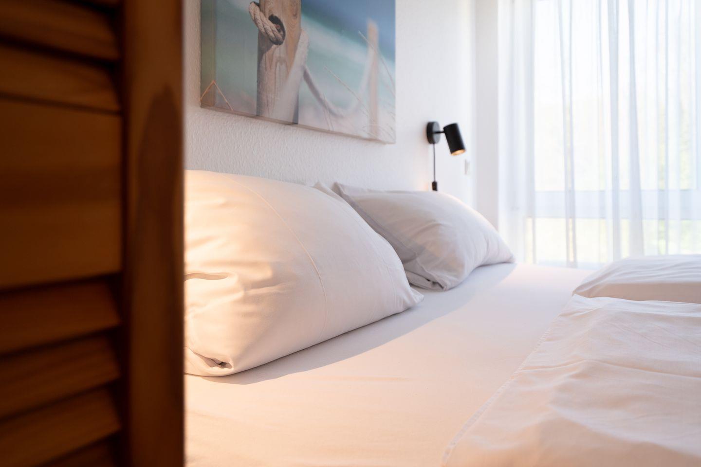Mit einem hellen Wohn-/ Essbereich, einer separaten Küche, zwei Bädern mit Dusche und einem möblierten Balkon mit Meerblick ist alles für einen angenehmen Aufenthalt vorhanden. Eines der insgesamt drei Schlafzimmer verfügt über ein Doppelbett, das Zweite über zwei Einzelbetten und das Dritte über ein Einzelbett.