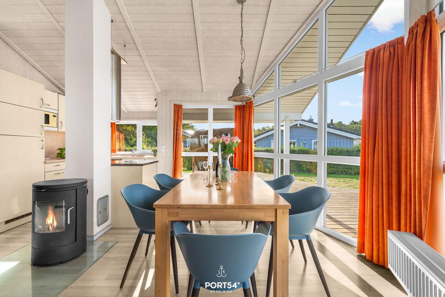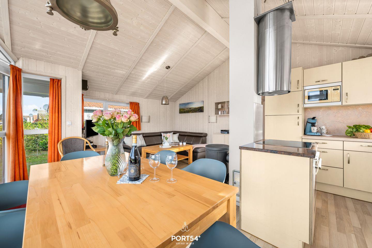 Drei separate Schlafzimmer mit allergikerfreundlichem Vinylboden bieten insgesamt sechs Schlafmöglichkeiten. Das lichtdurchflutete Wohnzimmer im Parterre ist offen mit dem modernen Essbereich und der hochwertigen Küche verbunden. Diese ist vollständig ausgestattet: Cerankochfeld, Backofen, Geschirrspülmaschine, Mikrowelle, Kühlschrank mit Gefrierfach, Kaffeemaschine, Senseo-Kaffeemaschine, Wasserkocher, Toaster, Mixer und sämtliches benötigtes Koch- sowie Essgeschirr stehen Dir zur Verfügung. Der angrenzende Essbereich und eine bequeme Sofaecke mit Kaminofen laden zum gemeinsamen Verweilen und zu entspannten Abenden ein.