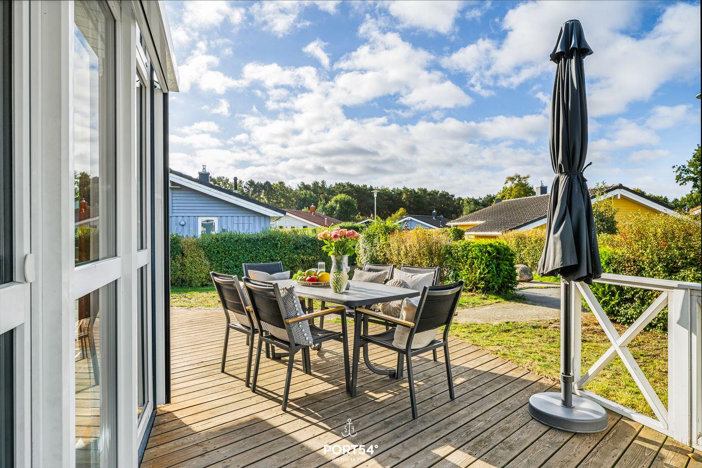 Die Terrasse mit Sonnenschutz, Gartenmöbeln, Strandkorb und Gartenlaube lädt dazu ein, sonnige Stunden oder Grillabende mit dem vorhandenen Kohlegrill zu genießen. Zur optimalen Entspannung und Privatsphäre sind alle Fenster mit Sichtschutz versehen, und Fliegengitter schützen vor Insekten.