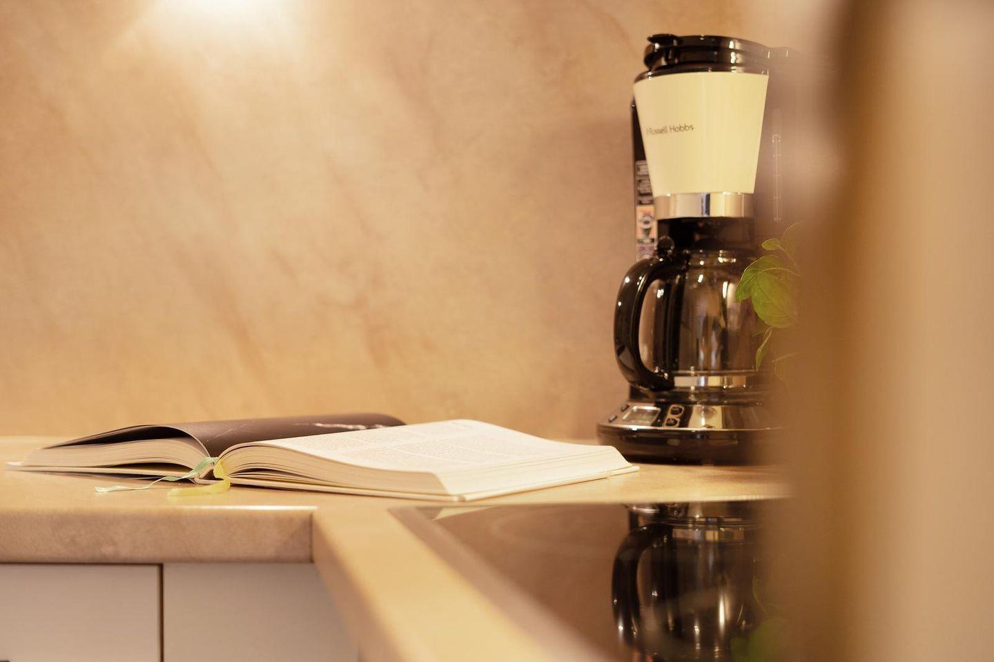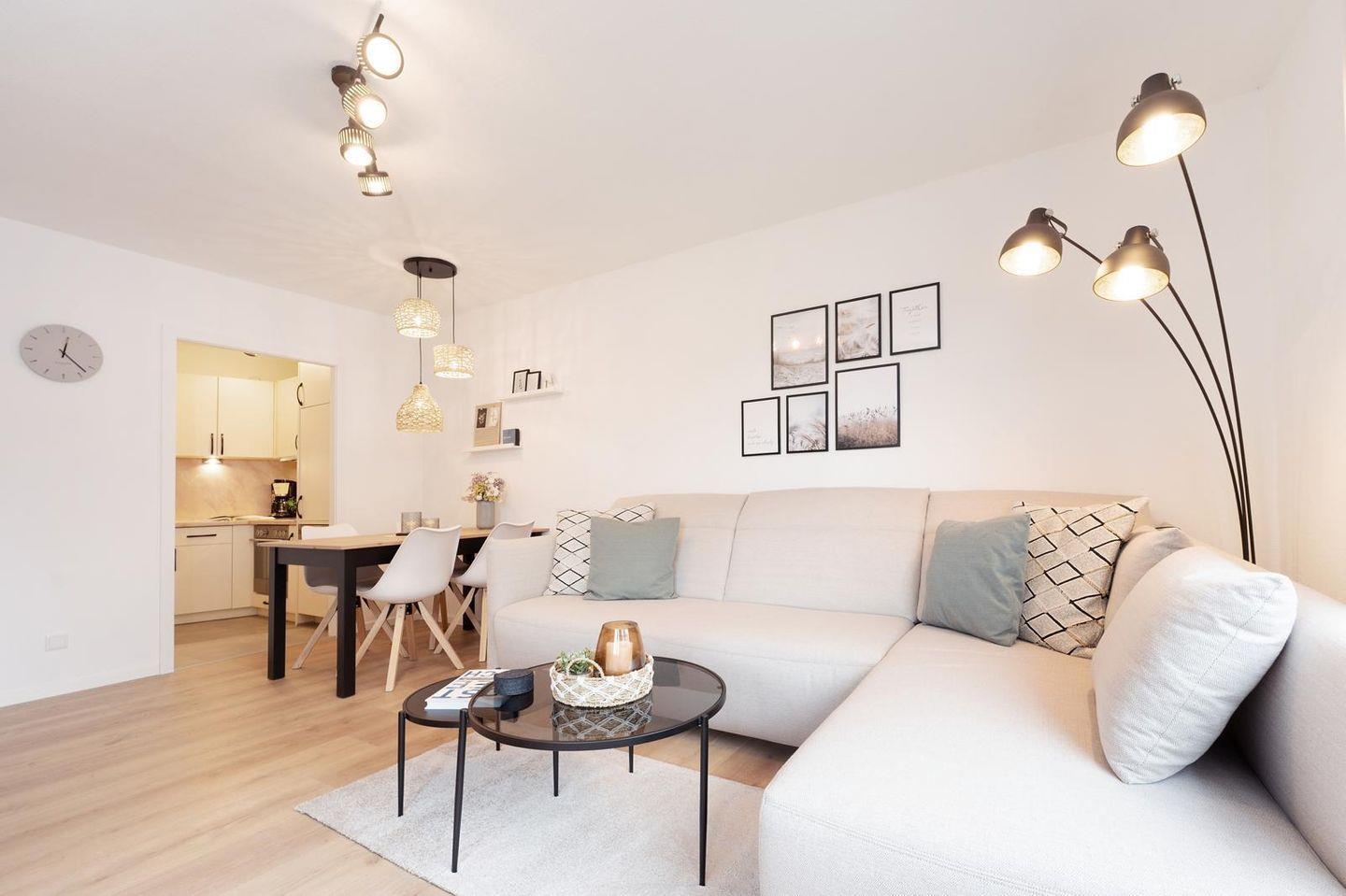 Der kuschelige Wohnbereich offeriert einen Smart-TV für gemütliche Fernsehstunden eine hochwertige Schlafcouch inklusive vollwertigem Lattenrost und Matratze als weitere Schlafmöglichkeit (165x200 cm). Von hier aus gelangen Sie auch auf den möblierten, überdachten Balkon und können den Meerblick und die frische Ostseeluft in vollen Zügen genießen. Im Wohnzimmer bietet zudem ein Esstisch ausreichend Platz, um die Mahlzeiten gemeinsam nach der Zubereitung in der angrenzenden Küche einzunehmen. Hier finden Sie alles, um sich fast wie zu Hause zu fühlen. Freuen Sie sich auf erholsame Nächte im separaten Schlafzimmer mit Doppelbett (2x 90x200cm) sowie TV und entspannen Sie herrlich in der Badewanne des hell gefliesten Badezimmers.