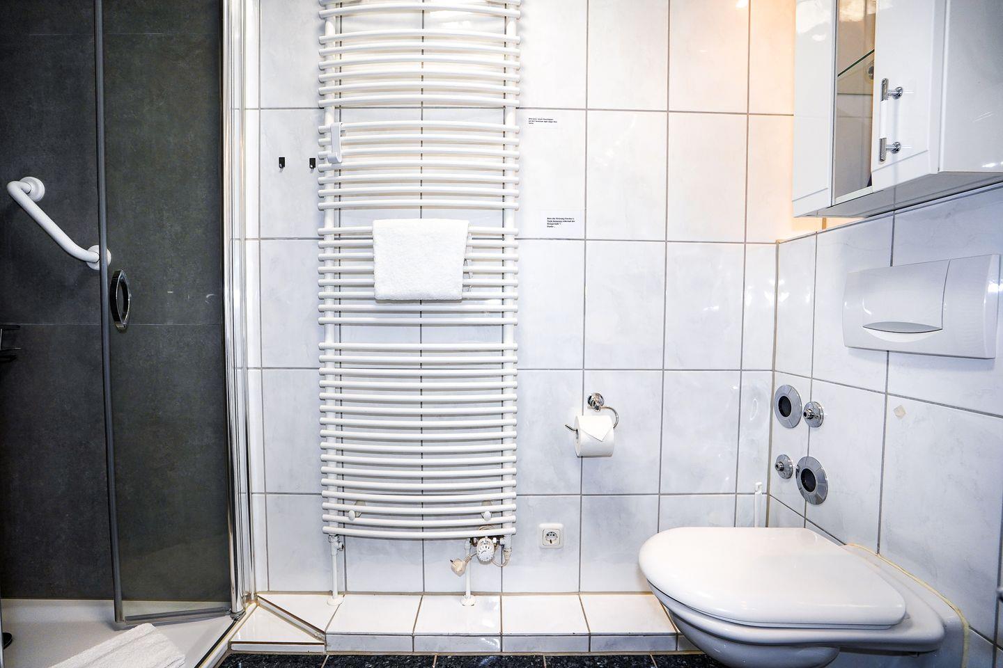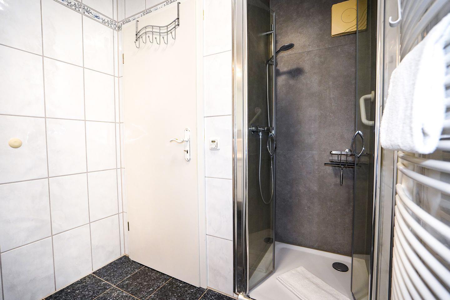 Das Badezimmer ist mit einer Dusche, Waschbecken, WC, Spiegel und warmem Wasser ausgestattet. Ein Ganzkörperspiegel, Wäscheständer, Staubsauger und weitere nützliche Utensilien stehen bereit.