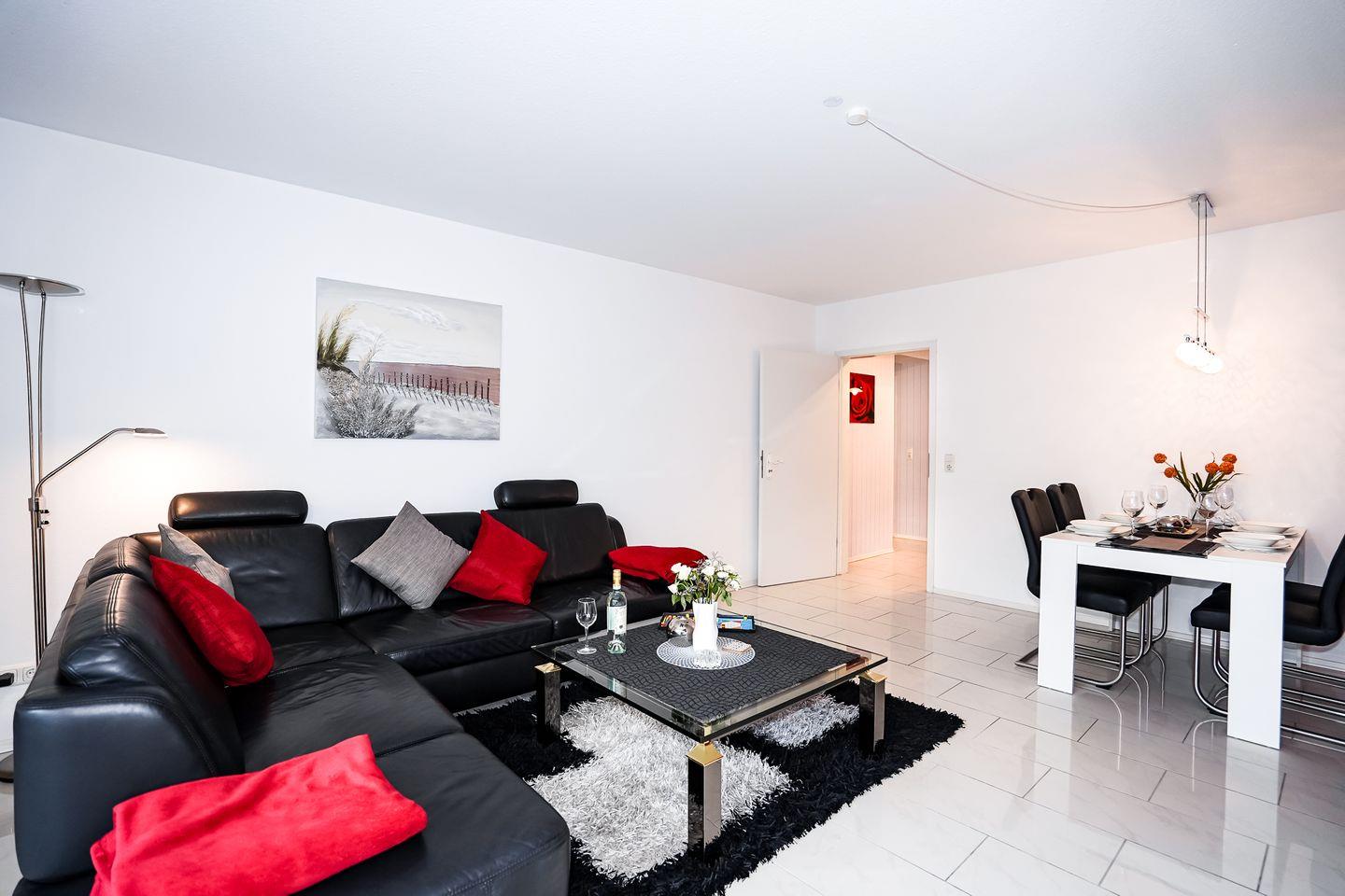 Im Wohnzimmer lädt eine gemütliche Sofaecke zum Entspannen ein. Für Unterhaltung steht ein Fernseher zur Verfügung, und die kostenfreie WLAN-Internetverbindung ermöglicht sowohl Informationssuche als auch Unterhaltung. Ein Essbereich mit Esstisch schafft einen freundlichen Rahmen für gemeinsame Mahlzeiten. Sichtschutz und Sonnenschutz an allen Fenstern sorgen für angenehme Privatsphäre.