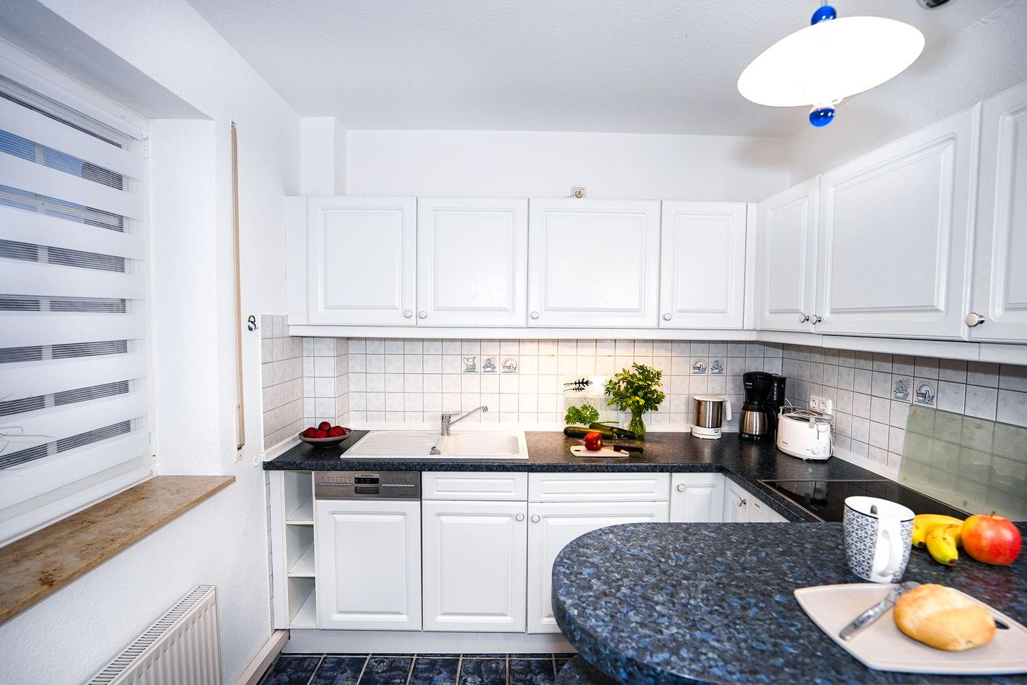 Die offene Küche ist umfassend für den täglichen Bedarf ausgestattet: Neben einem Ceranherd, Backofen, Kühlschrank mit Gefrierfach, Spülmaschine, Mikrowelle, Wasserkocher, Toaster und Kaffeemaschine stehen Ihnen sämtliche Küchenutensilien zur Verfügung. Der angrenzende Essbereich fügt sich harmonisch ins Gesamtbild ein.