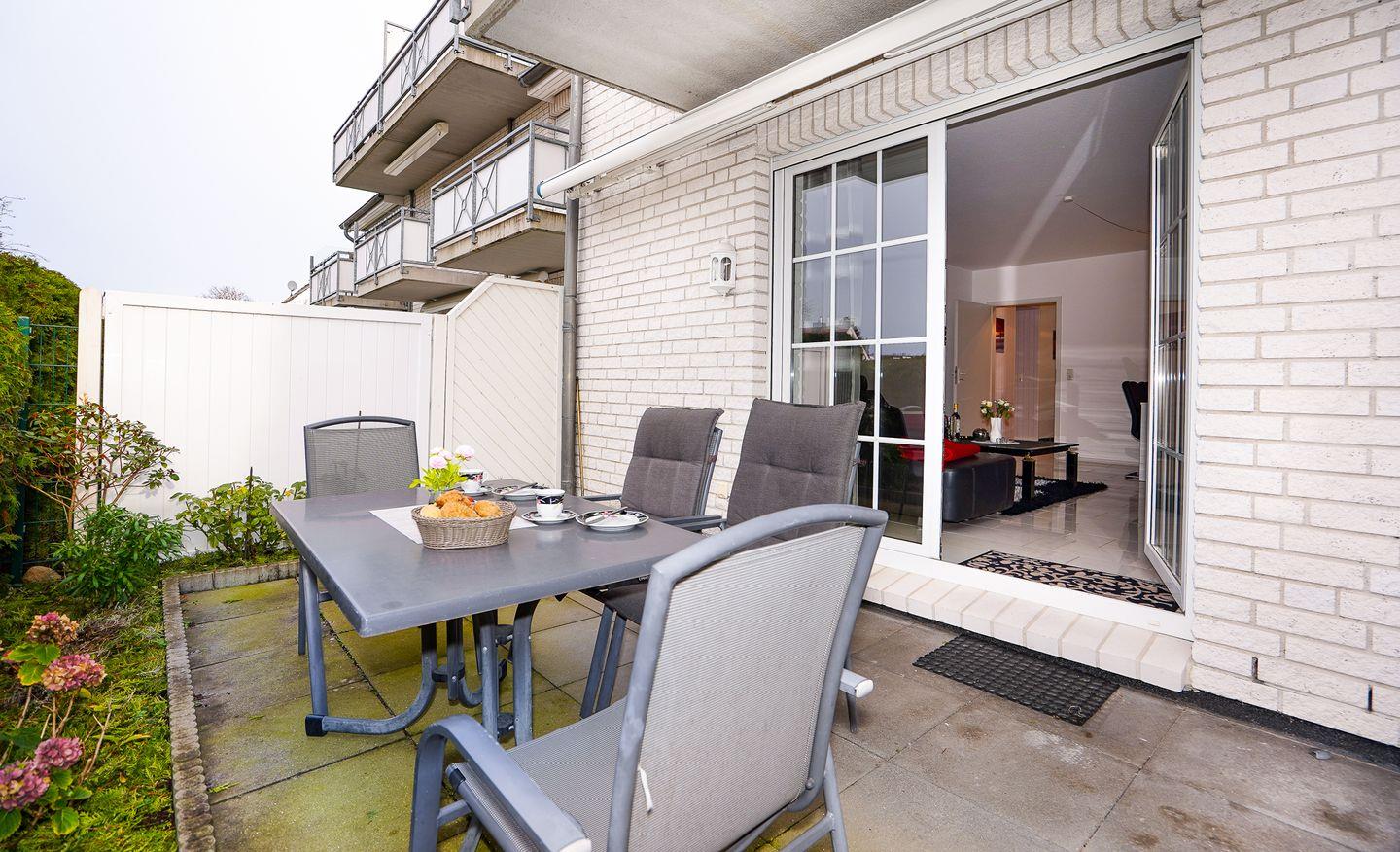 Die Unterkunft bietet direkten Zugang zu einer eigenen, schön angelegten Terrasse im Erdgeschoss. Hier erwarten Sie bequeme Gartenmöbel, die zum Verweilen und dem Genuss ruhiger Momente im Freien einladen.