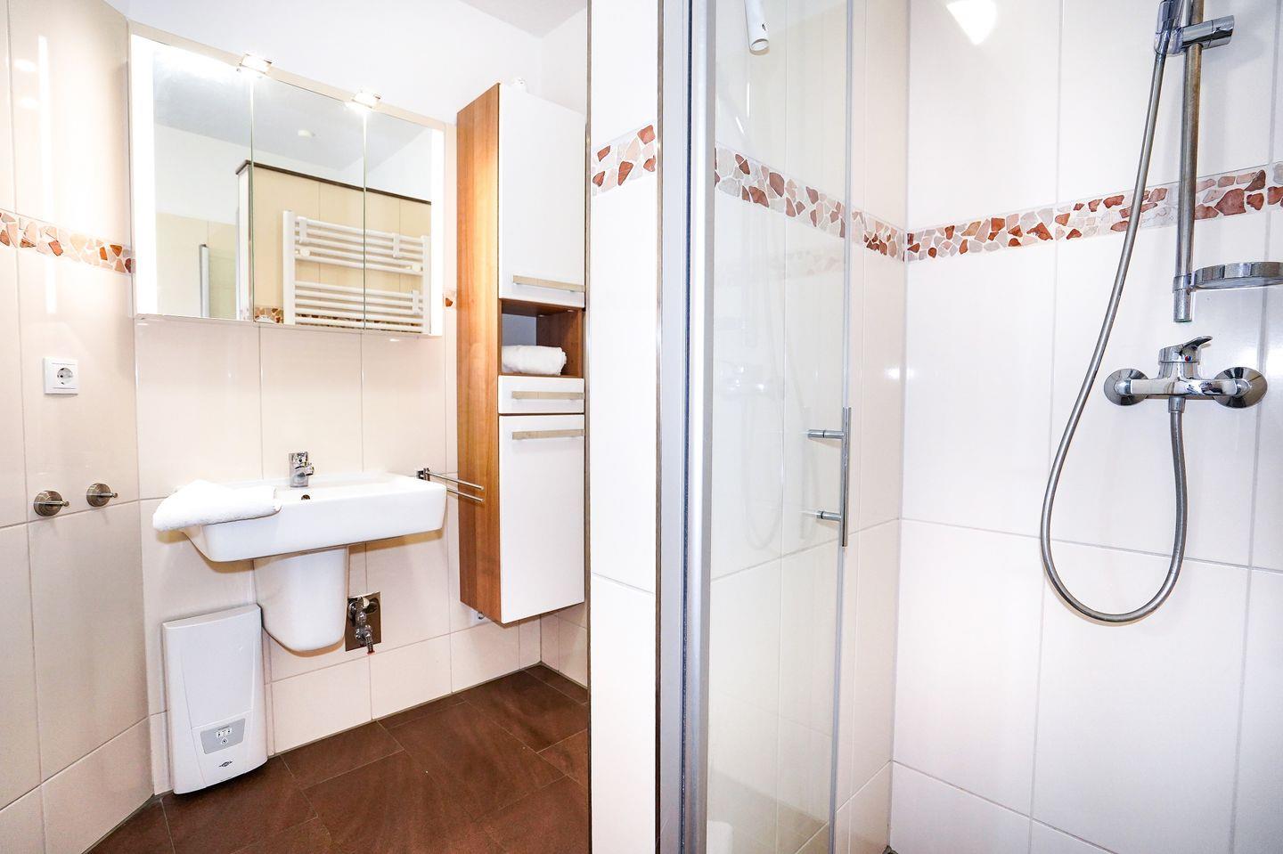 Das Badezimmer verfügt über eine Dusche, Waschbecken, Spiegel sowie ein WC. Für zusätzlichen Komfort stehen Ihnen nützliche Utensilien wie ein Ganzkörperspiegel, ein Wäscheständer, Staubsauger sowie eine Kommode zur Verfügung. Ein Sichtschutz an allen Fenstern gewährleistet Privatsphäre.
