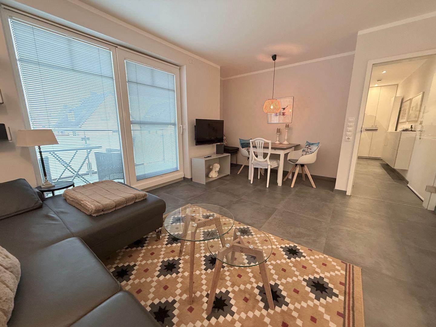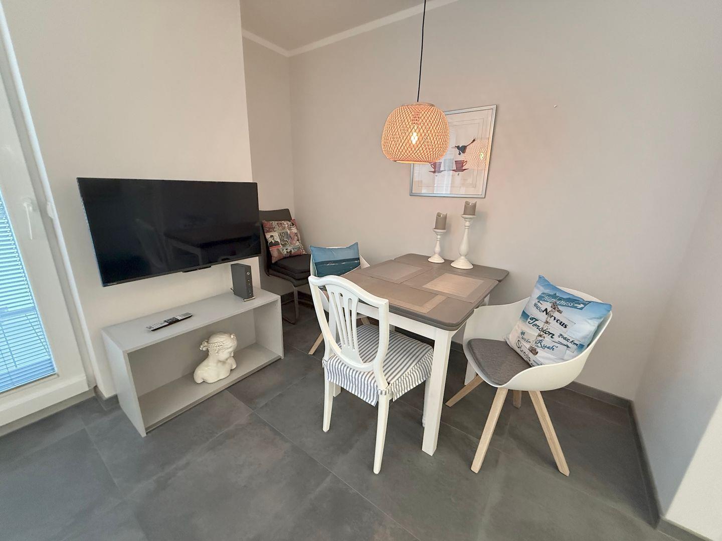 Im Wohnzimmer finden Sie neben einer einladenden Sofaecke einen Esstisch sowie moderne Unterhaltungstechnik mit zwei TV-Geräten, einer Spielekonsole, einem Radio und einer Auswahl an Büchern. Der Zugang zum privaten Balkon, der mit Gartenmöbeln und einer Markise ausgestattet ist, ermöglicht es Ihnen, entspannte Stunden im Freien zu verbringen. Der Sichtschutz an allen Fenstern sorgt dabei für Ihr Wohlbefinden und ausreichend Privatsphäre, während Innen eine Fliesenboden in Wohn- und Schlafzimmer in Verbindung mit einer Fußbodenheizung für angenehme Wärme sorgt.