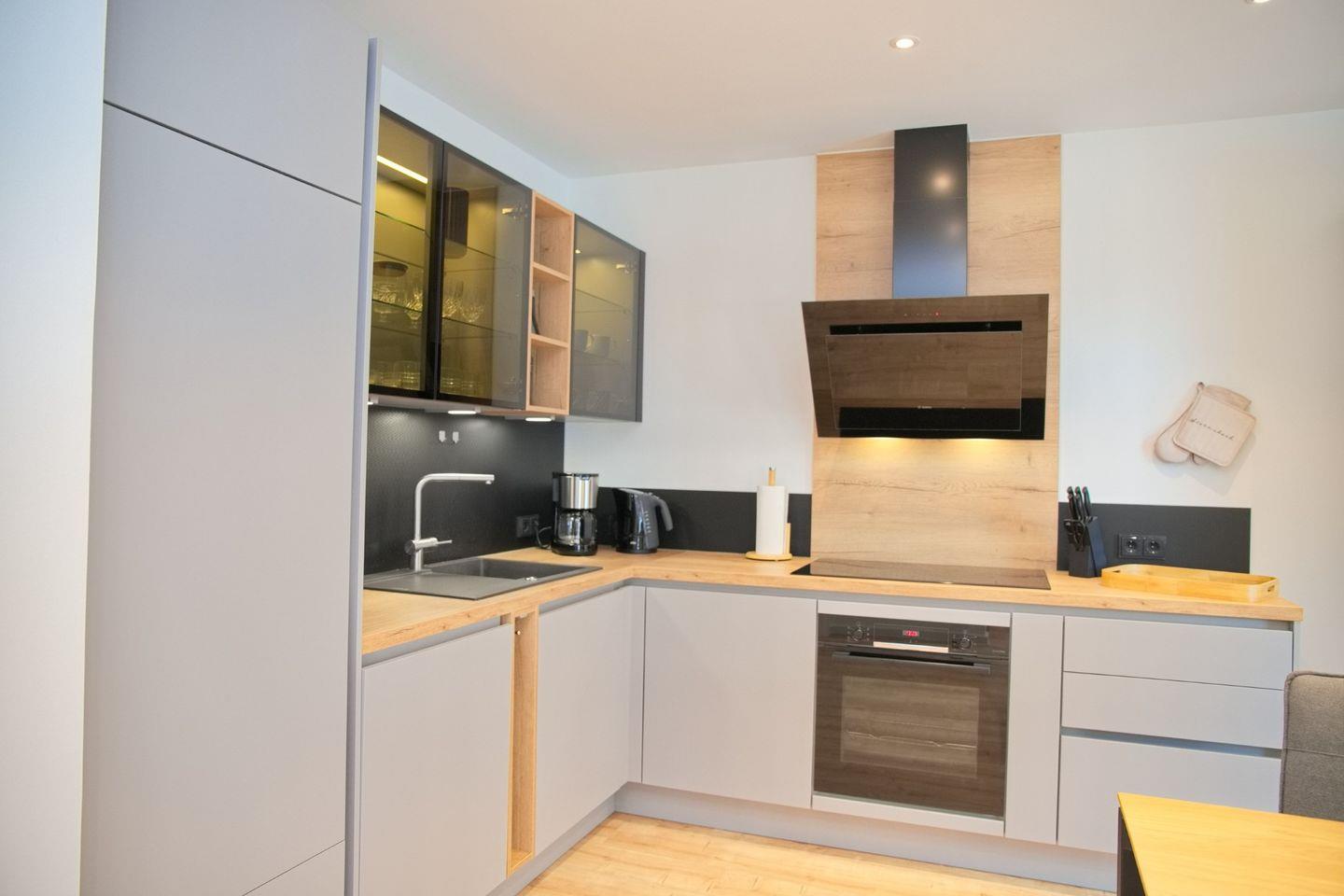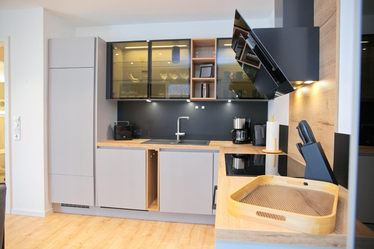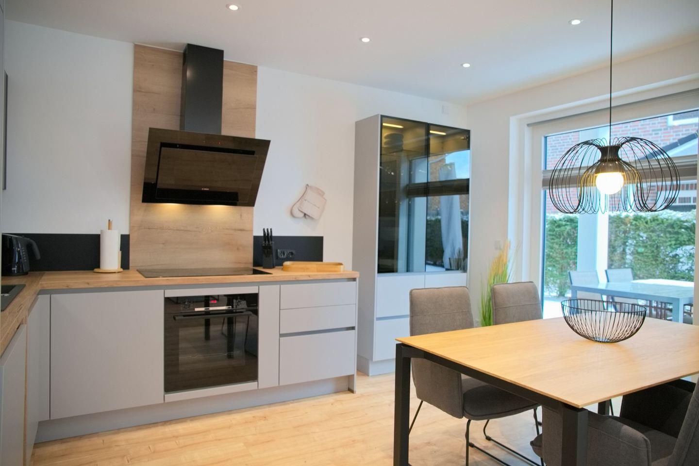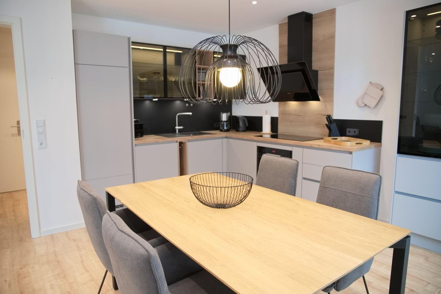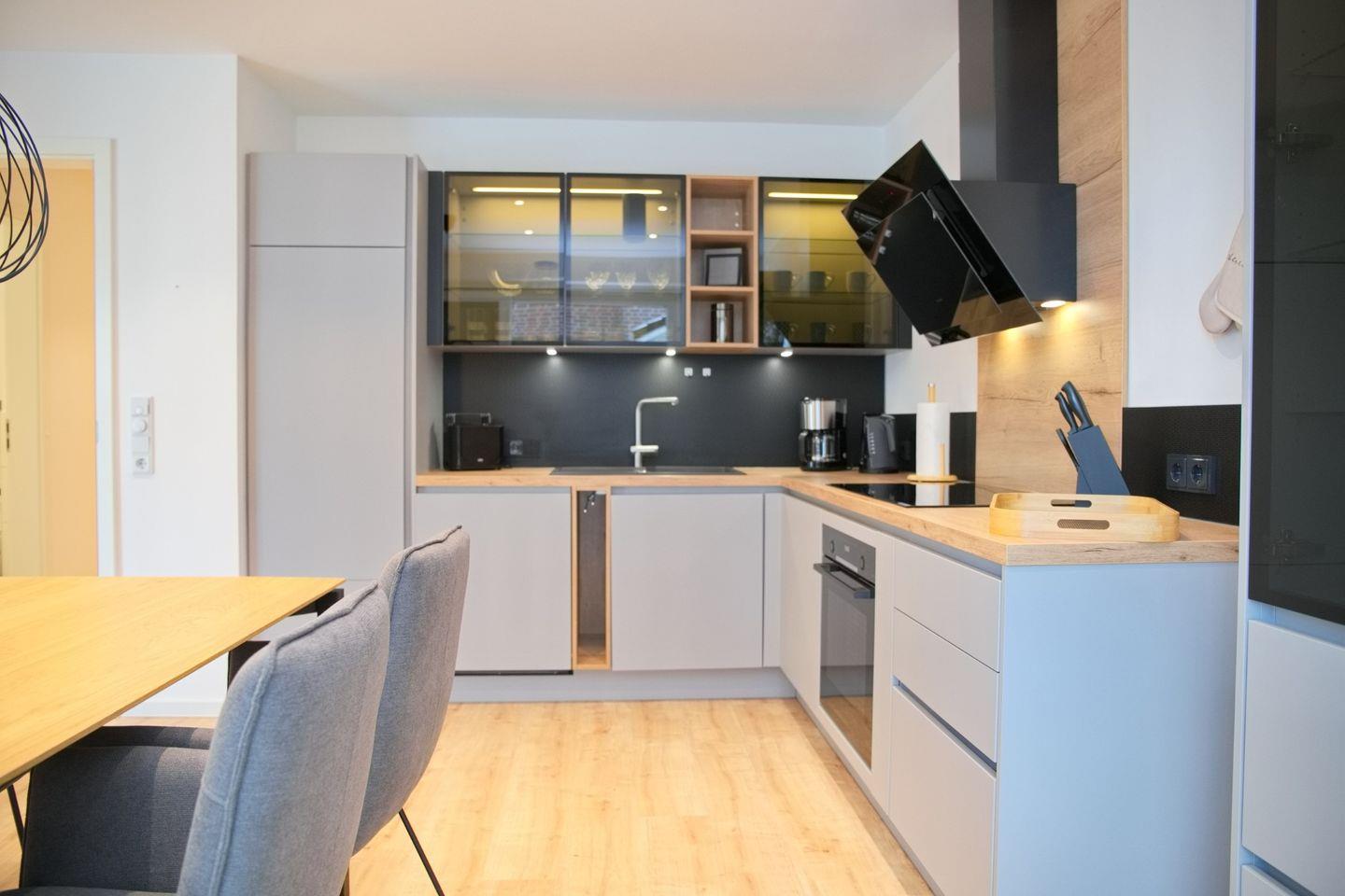 Der helle Wohnbereich lädt mit seiner gemütlichen Einrichtung zum Verweilen ein und ist mit elektrischen Außenrollläden ausgestattet, die zusätzlichen Komfort und Privatsphäre bieten. Direkt angrenzend befindet sich ein Essbereich für zwei Personen, der sich ideal für gemeinsame Mahlzeiten eignet. Die voll ausgestattete Küche lässt keine Wünsche offen: Neben einem modernen Induktionskochfeld und einem Backofen stehen Ihnen ein Kühlschrank mit Gefrierfach, eine Spülmaschine sowie praktische Küchengeräte wie Wasserkocher, Kaffeemaschine und Toaster zur Verfügung, perfekt für einen sorgenfreien Selbstversorger-Urlaub.