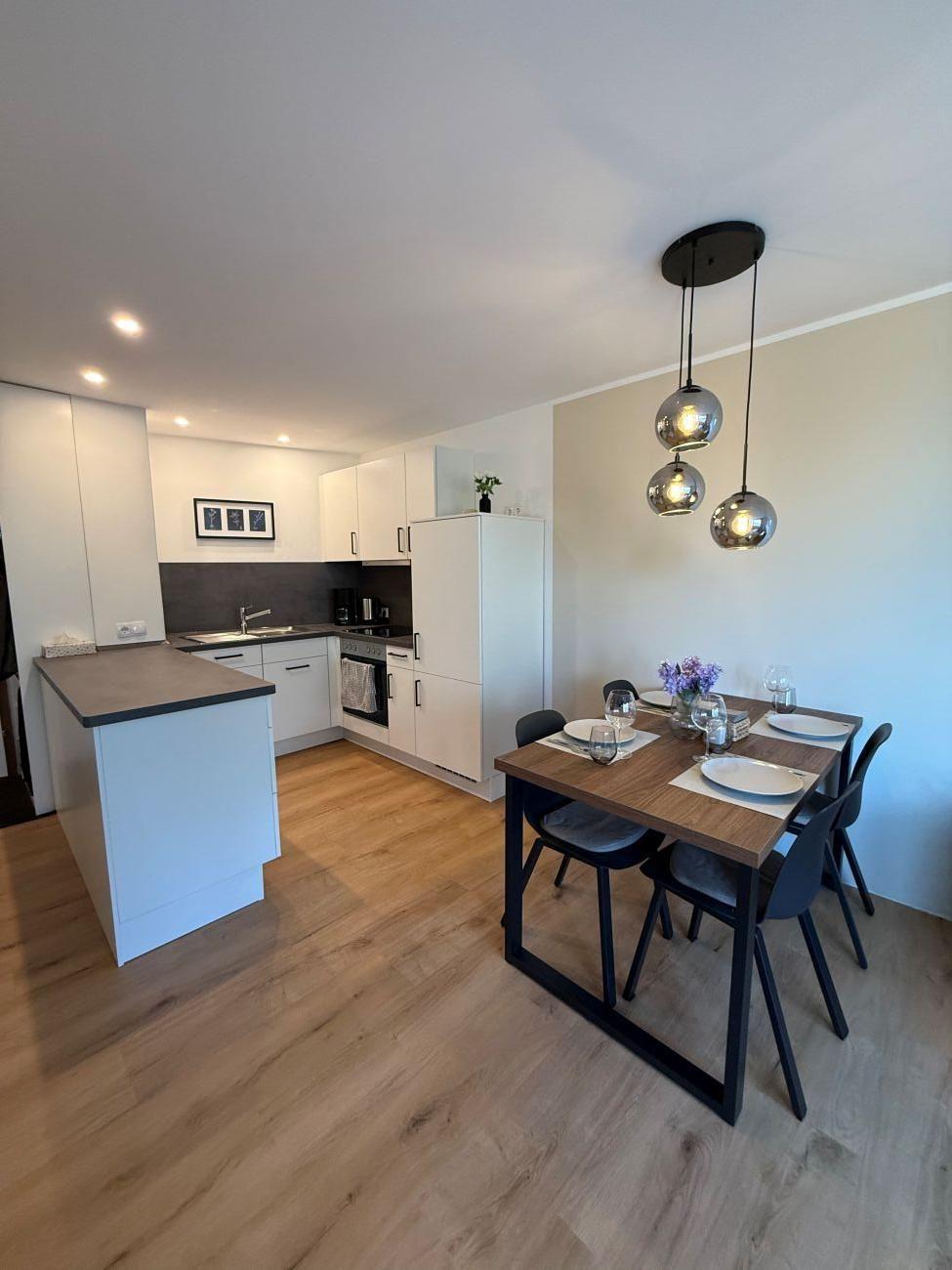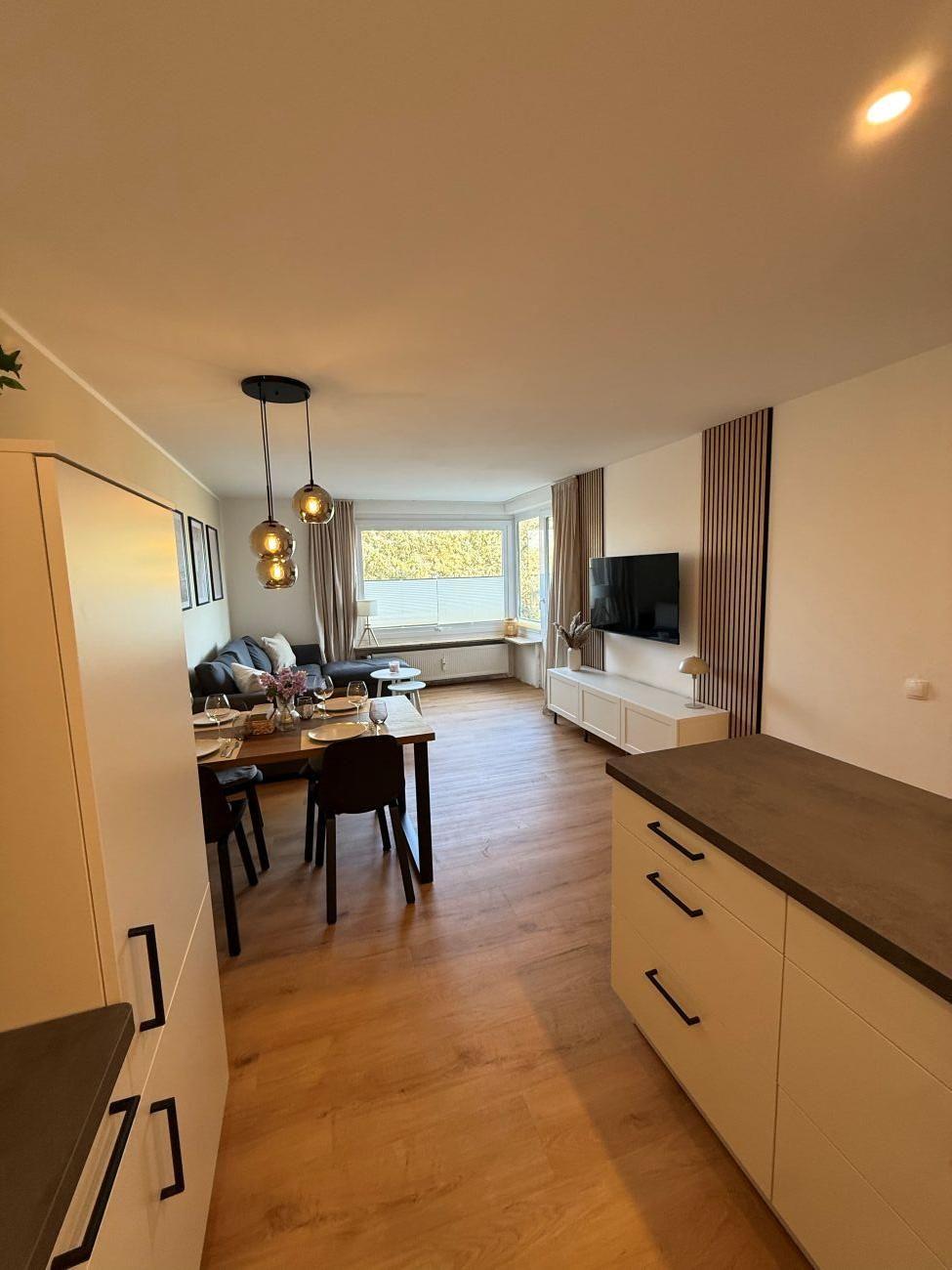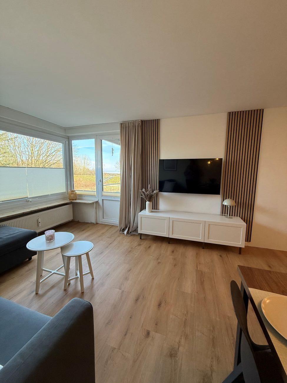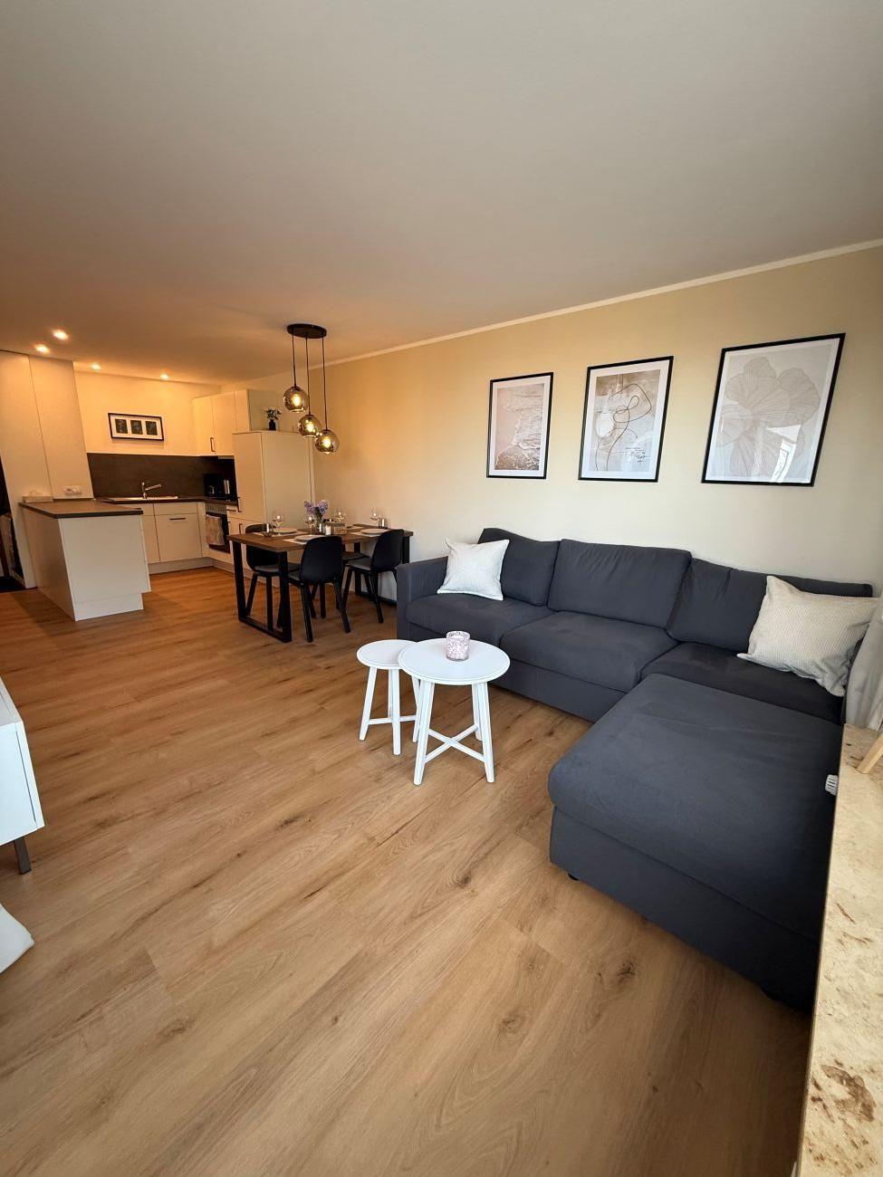 Der gemütlich/modern ausgestattete Wohn- und Essbereich bildet das Herzstück der Ferienwohnung. Hier lässt sich abends ein gemütlicher Fernsehabend auf dem neuen Schlafsofa verbringen oder Sie genießen einfach den schönen Ausblick zur Ostsee.