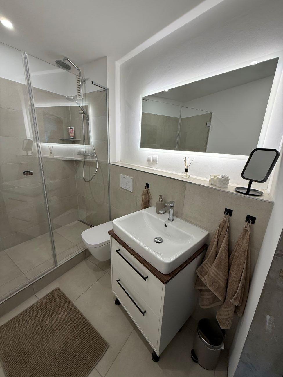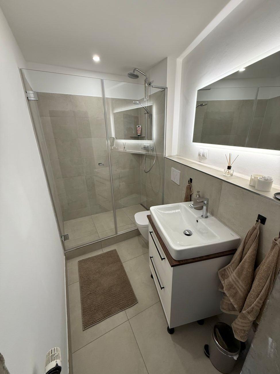 Das hell geflieste Badezimmer ist mit einer großen Dusche, Waschbecken, WC und Heizkörper ausgestattet.