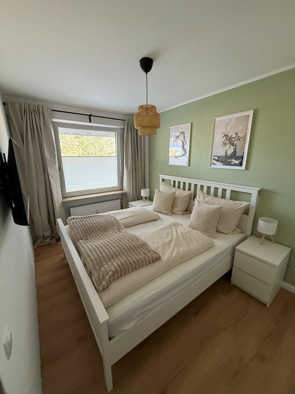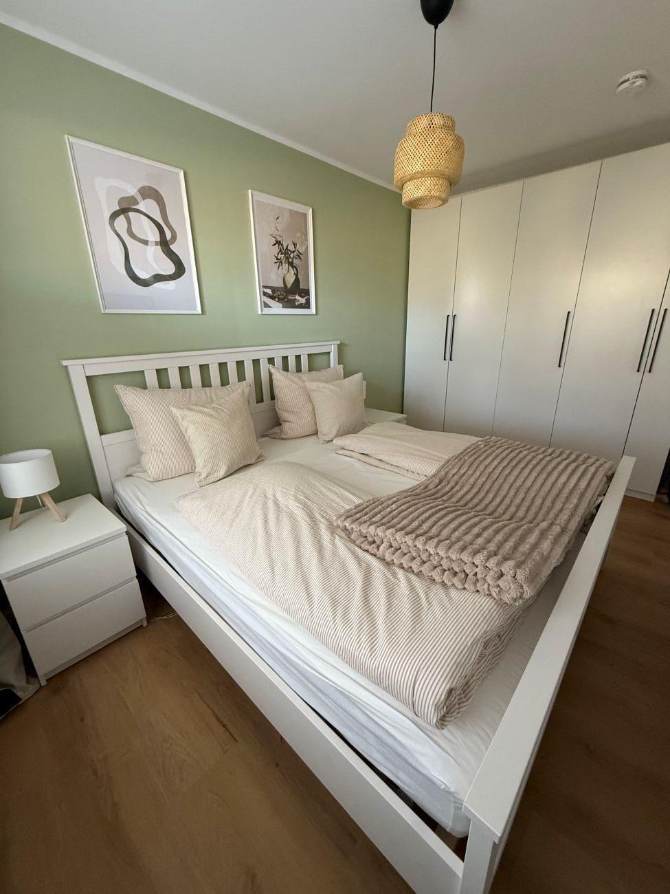 Vom Flur aus gelangen Sie in das gemütliche Schlafzimmer mit Fernseher, Doppelbett (180cm x 200 cm) und einem großzügigen Kleiderschrank für Ihre Urlaubsgarderobe.