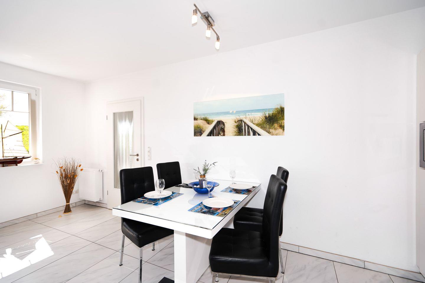 Ein Essplatz für 4 Personen sowie eine schicke Ledercouch mit Sessel und Kleinmöbel runden das Bild ab.