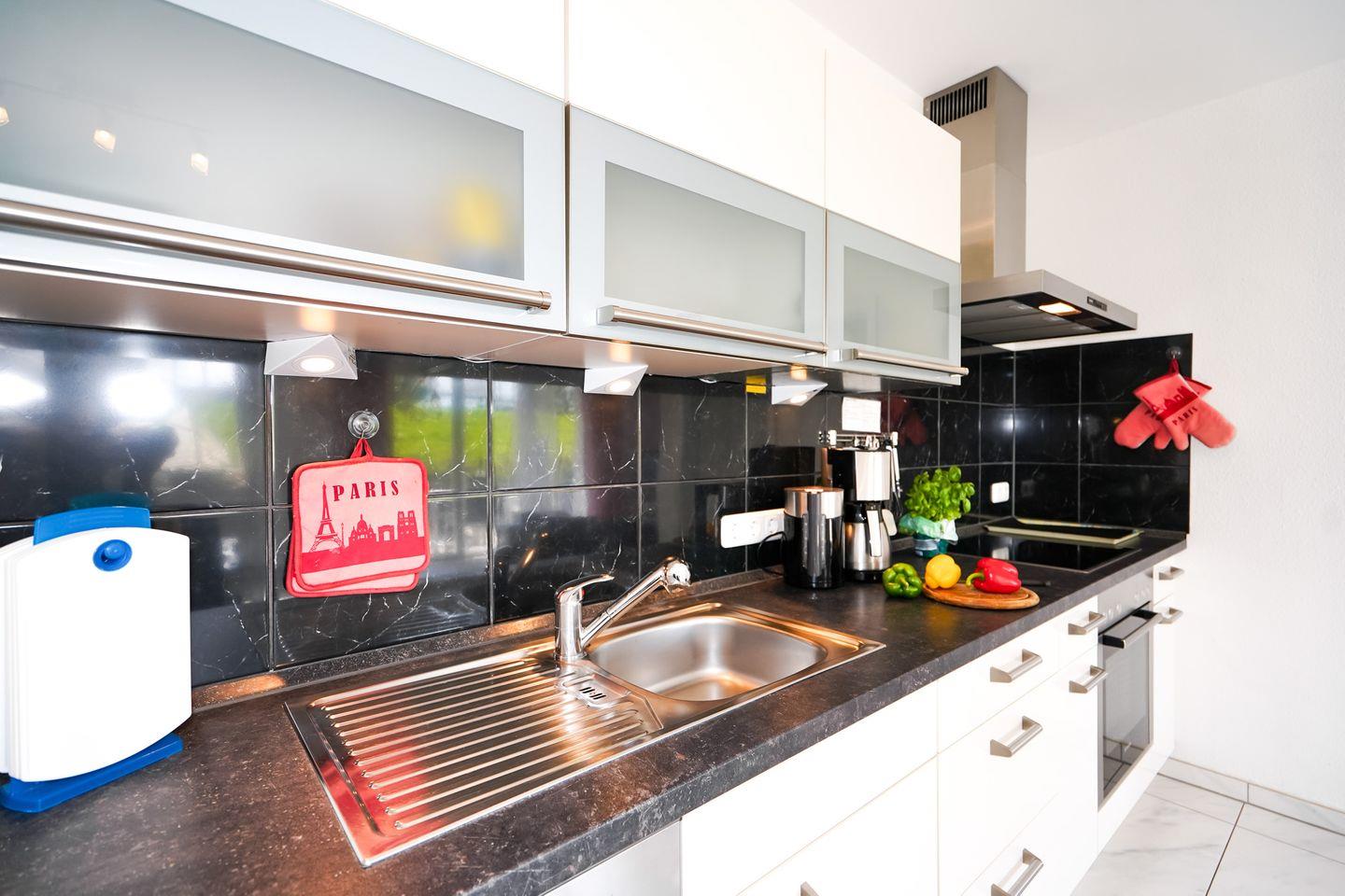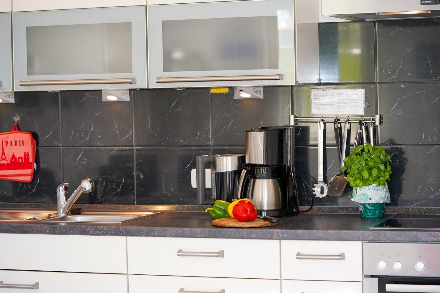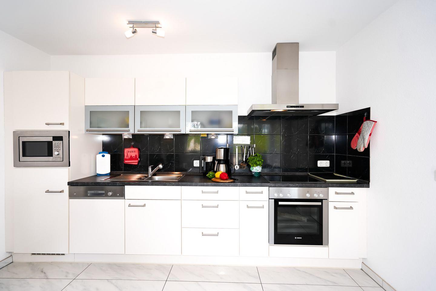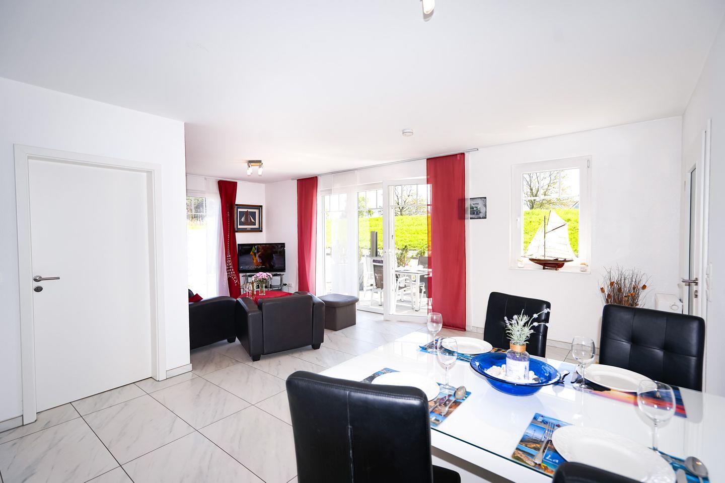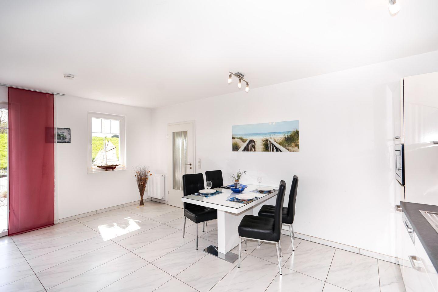 Der Wohn-/Essbereich ist mit einer modernen Küche ausgestattet.