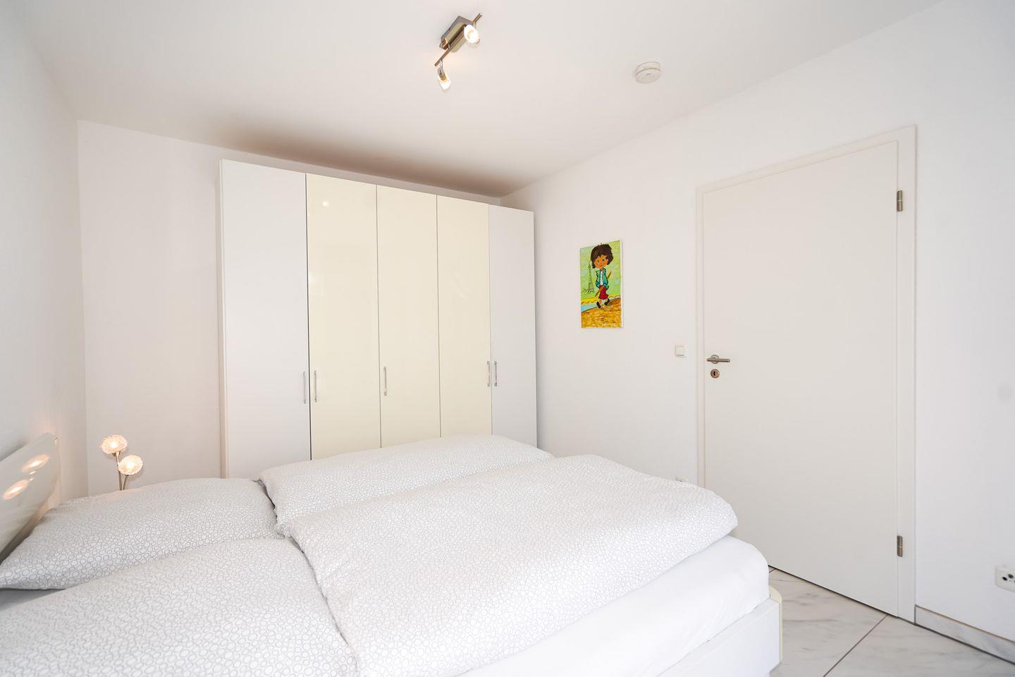 Das hell eingerichtete Schlafzimmer mit Doppelbett, Kleiderschrank und eigener Stein-Terrasse lässt keine Wünsche übrig.