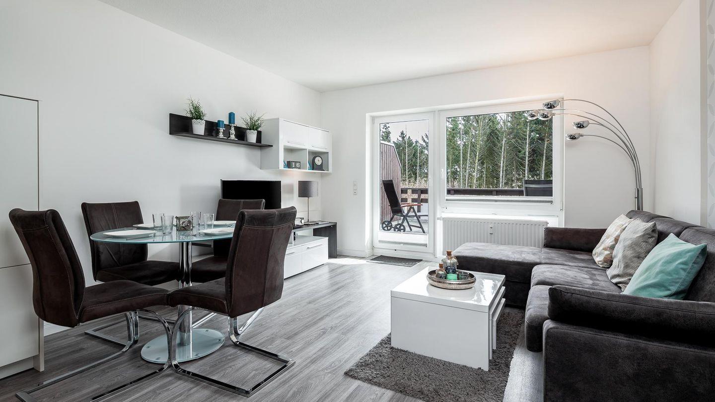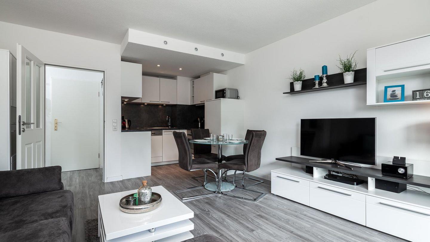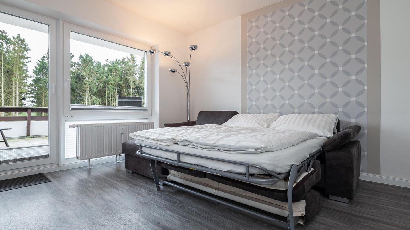Das hell eingerichtete Wohnzimmer bietet ausreichend Platz für 4 Personen. Ein hochwertiges Schlafsofa lässt Sie wie im eigenem Bett schlafen.
