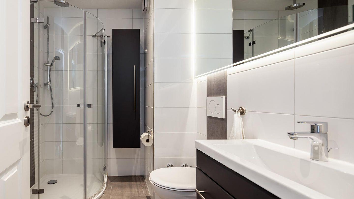 Das Duschbad mit seiner bodentiefen Dusche ist hell/ braun gefliest und bietet genug Platz für die persönlichen Dinge.