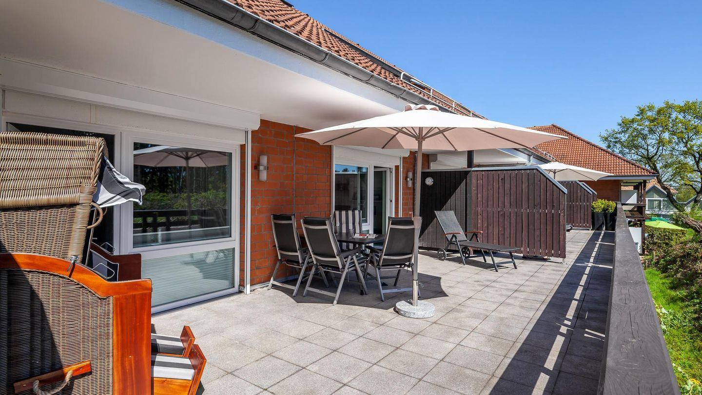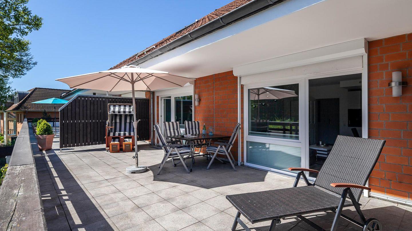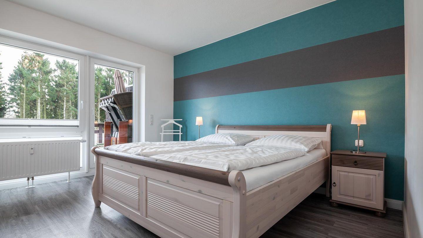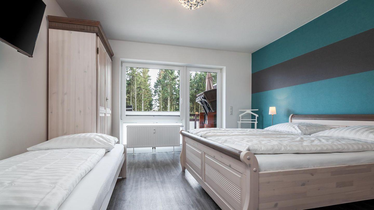 Vom Schlafzimmer, mit einem Doppelbett, Gästebett (1 Person) und Kleiderschrank, gelangen Sie, ebenso wie vom Wohnzimmer, auf die ca. 32 m² große Dachterrasse mit Gartenmöbeln und Strandkorb.