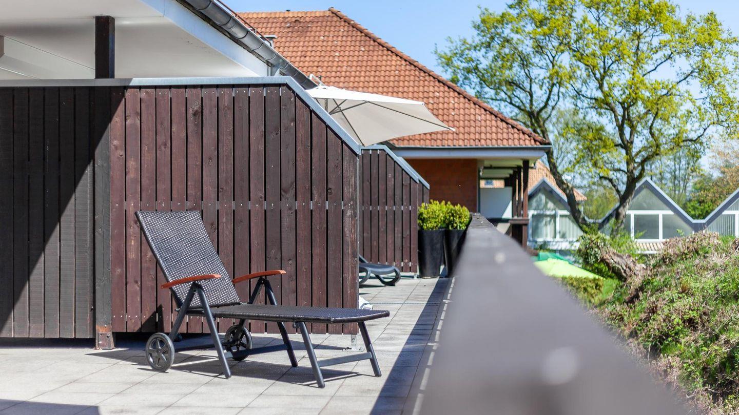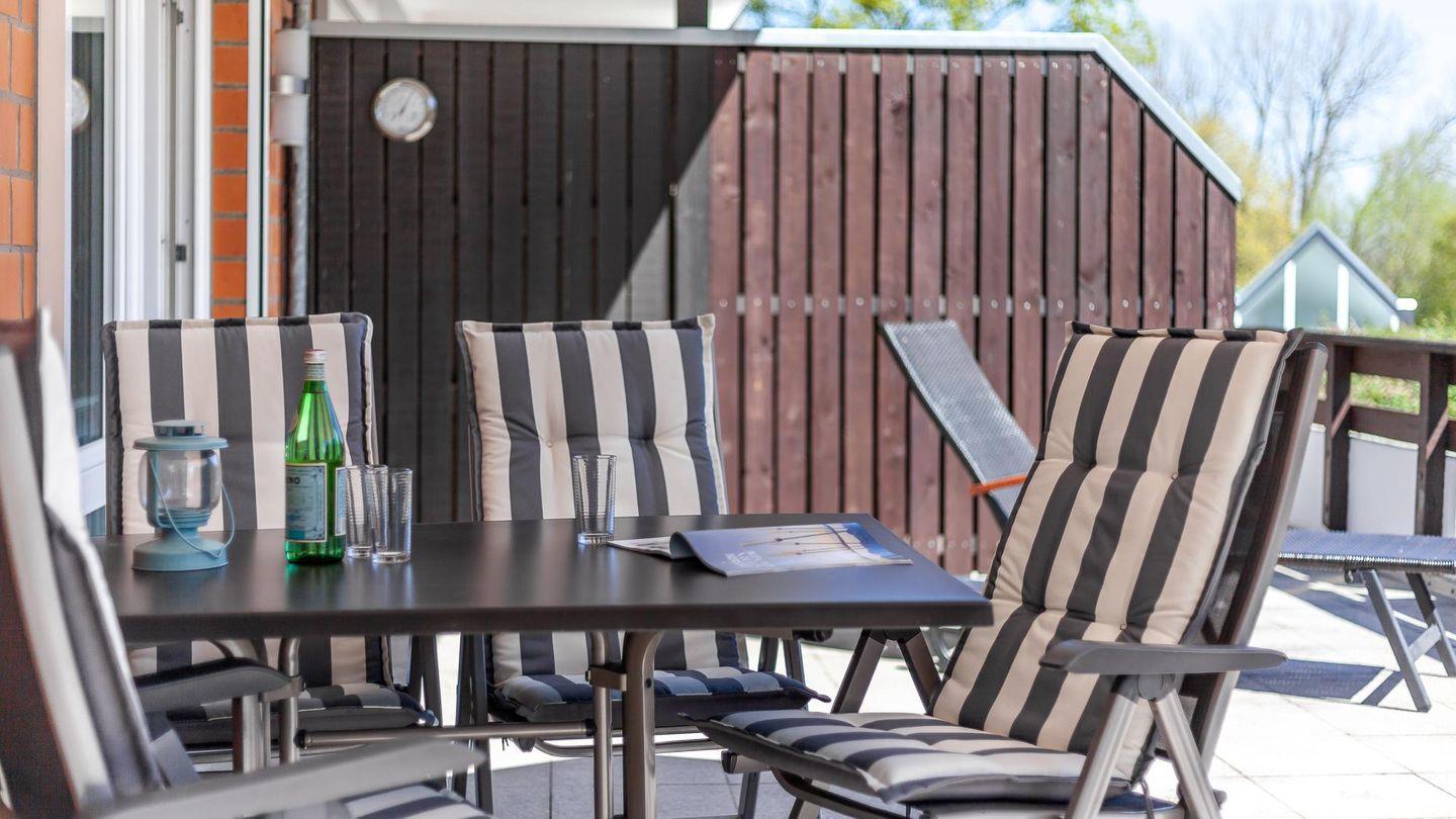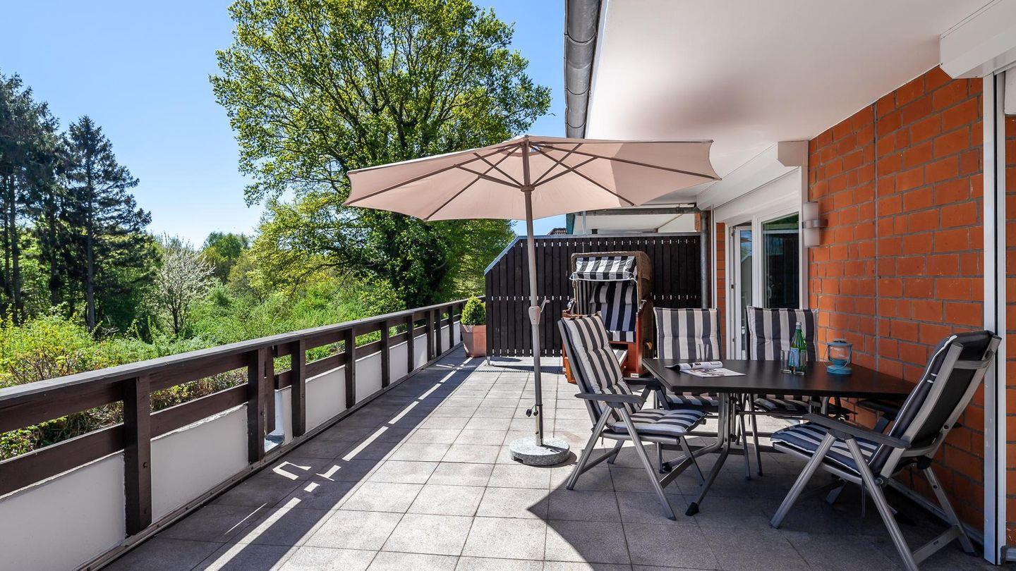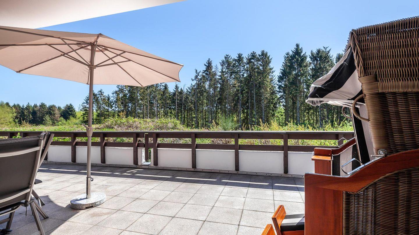 Vom Schlafzimmer, mit einem Doppelbett, Gästebett (1 Person) und Kleiderschrank, gelangen Sie, ebenso wie vom Wohnzimmer, auf die ca. 32 m² große Dachterrasse mit Gartenmöbeln und Strandkorb.
