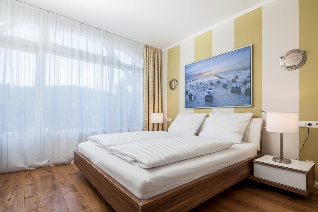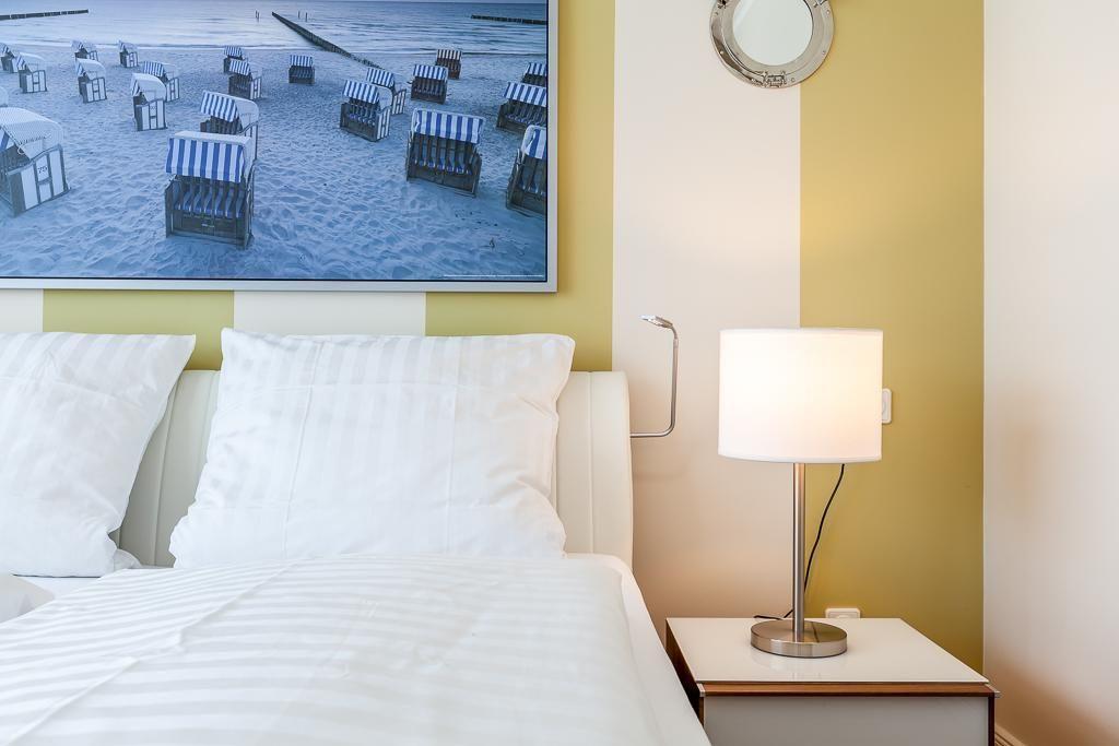 Das elegante helle Schlafzimmer verfügt mit hochwertigen Federkernmatratzen, großem beleuchteten Kleiderschrank, LED-Leseleuchten, Gute-Nacht-Beleuchtung und LCD-Fernseher besten Komfort.