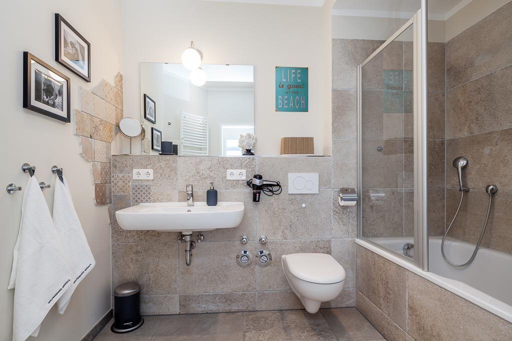 Das große Vollbad mit Badewanne, Regen- und Brausedusche, Fön und Handtuchheizung ist mit Naturstein gefliest, bietet genug Platz für alle persönlichen Dinge.